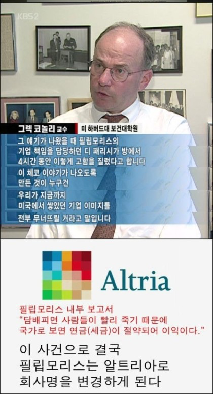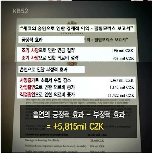 체코 정부가 흡연으로 인한 의료비 증가를 우려해 담뱃세를 높이는 방안을 검토했는데, 필립 모리스는 세금 인상을 막기 위해 흡연이 체코의 국가 예산에 미치는 효과에 대한 비용과 편익 분석 작업을 진행했다. 이 조사를 통해 필립 모리스는 체코 정부가 흡연으로 잃는 돈보다 흡연으로 인한 사망자의 증가로 인해 얻는(절약하는) 돈이 더 많다고 발표했다.
