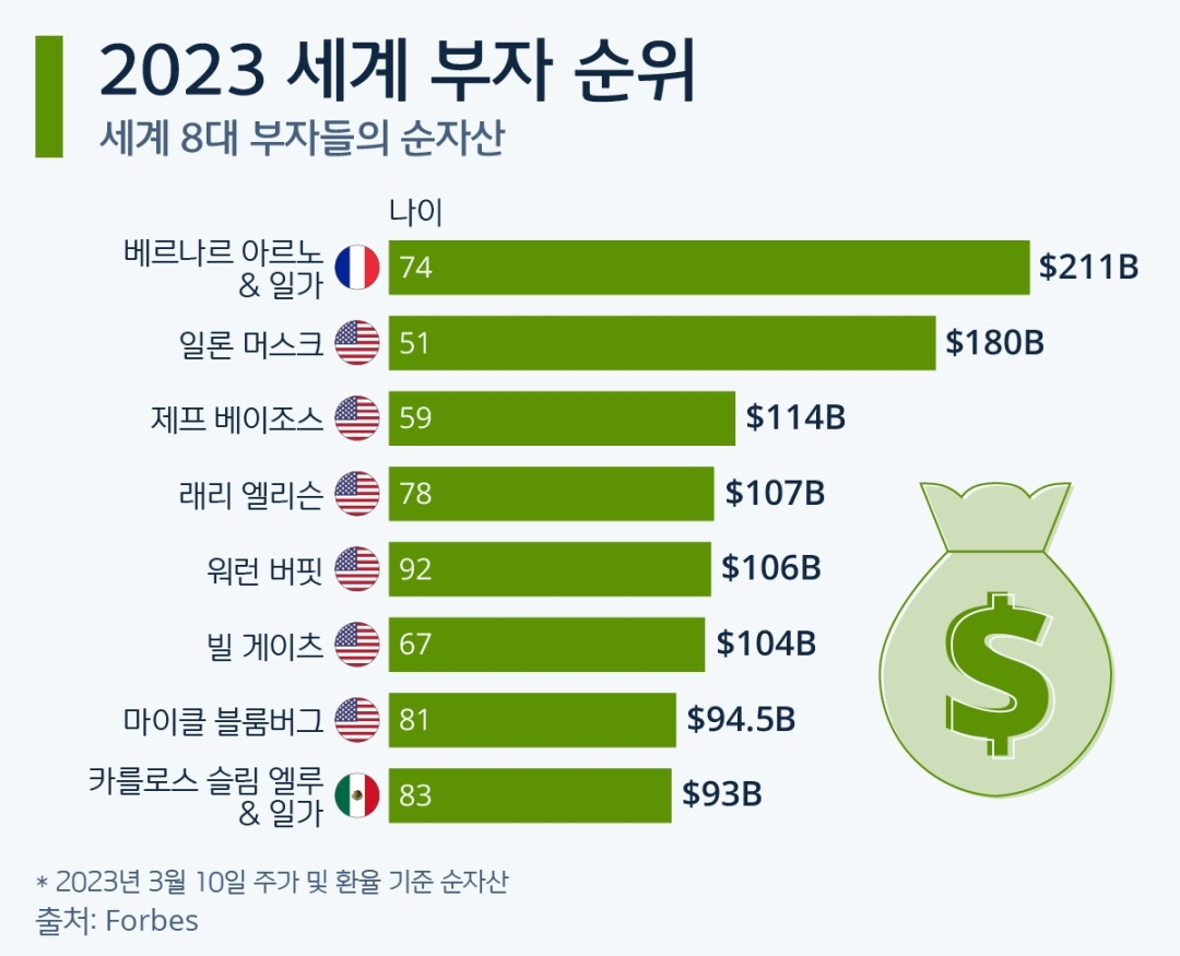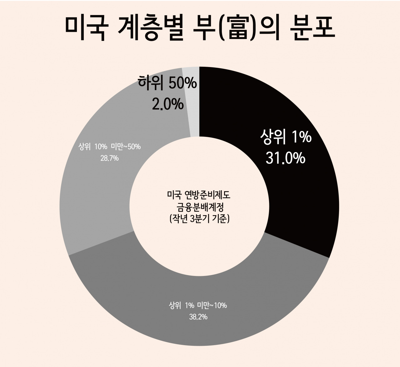 포브스는 매년 미국의 400대 부자 명단을 발표한다. 지난 10여 년동안 빌 게이츠(Bill Gates)가 1위를 차지했는데 2008년 기준 그의 순자산은 570억 달러로 추정된다. 미국의 상위 1퍼센트 부자가 미국 전체 부의 3분의 1을 소유하고 있으며, 이는 하위 ‘90퍼센트’에 해당하는 사람들의 부를 모두 합친 것보다 많은 액수이다. 또한 상위 10퍼센트 가정이 미국 전체 소득의 42퍼센트, 전체 부의 71퍼센트를 소유하고 있다.