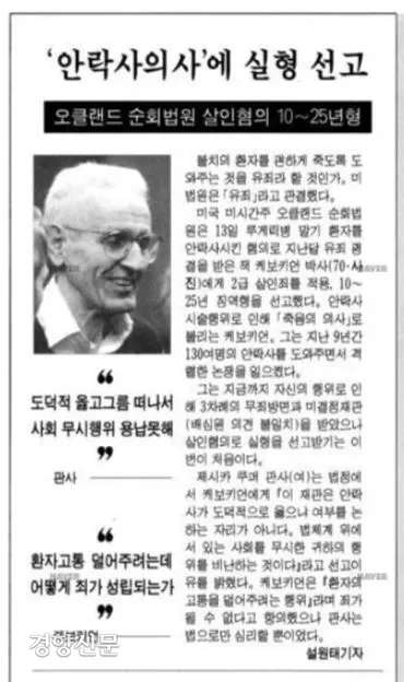 ‘죽음의 의사’로 불리게 된 그는 1990년대에 안락사 허용 운동을 벌였고, 환자 130명의 자살을 도우며 자신의 주장을 실천에 옮겼는데, CBS 텔레비전 프로그램에 자신의 비디오 하나를 보낸 뒤 2급 살인 혐의로 재판에 회부되어 유죄 판결을 받았던 것이다.