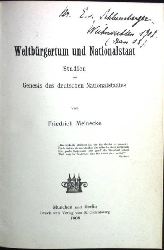 먼저 1907년에 발행된 《세계시민주의와 민족국가(Weltbürgertum und Nationalstaat)》의 마이네케는 비스마르크 제국에서 독일의 민족적 이상이 실현되는 것을 자신있게 발견하고 있으며, 민족주의를 보편주의의 최상의 형태와 동일시켰다.