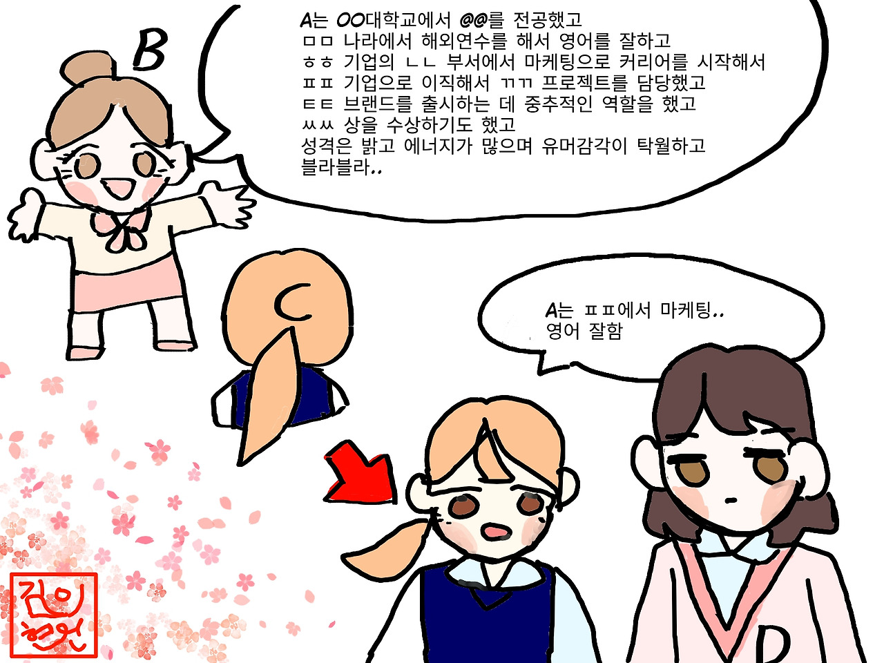 문제(?)는여기서 시작됩니다. 이렇게 자세한 이야기를 들은 C는 본인의 상사인 D에게 A에 대해서 어떻게 이야기를 하게 될까요? 상황에 따라 다를 수 있겠다는 것을 전제로 제 주관적인 경험과 생각에 따르면 C가 D에게 A에 대해서 하는 설명은 키워드 기준으로 2가지 정도이고 많아봐야 3가지를 넘지 않을 것입니다.