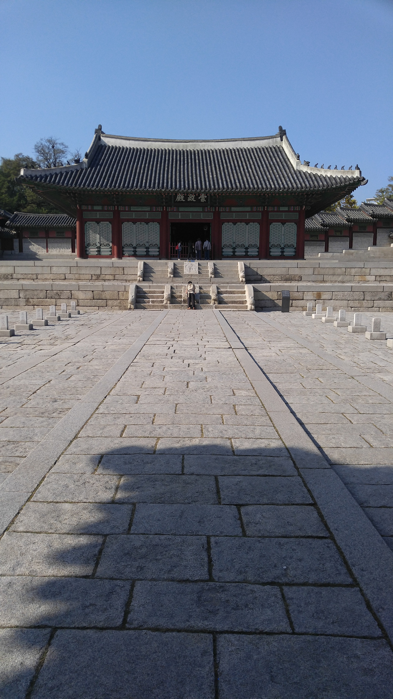 궁궐의 중심건물을 정전이라고 부른다. 경희궁의 정전은 바로 숭정전이다. 숭정전은 광해군 시절 공사 때 이미 지어진 전각으로, 계속 경희궁의 정전으로서 기능해왔다. 경희궁은 인조 이래로 창덕궁과 함께 양대 궁궐을 이루었다. 창덕궁이 동궐, 경희궁이 서궐이었다. 조선 후기의 왕들 대다수가 경희궁에서 많은 시간을 보냈다. 정조가 즉위한 곳도 바로 숭정전 앞의 뜰이다. 이렇듯 숭정전은 조선 후기 정치의 중심적인 장소로서 기능했다는 것을 알 수 있다. 경희궁의 낮은 인지도가 무색하게, 숭정전은 대중에게 많이 노출되는 전각이다. 많은 사극에서 조선시대 왕궁으로 모습을 보이기 때문이다. 후술 하겠지만, 복원된 건축물인 탓에 훼손 등의 염려가 덜한 탓에 그런 것이 아닐까 싶다. 가을에 찾은 숭정전은 시원한 바람과 함께 방문객들을 맞이했다. 나는 왼쪽 행각을 따라 걸으며 숭정전을 감상했다. 기분 탓인지, 굉장히 적막한 분위기를 느꼈다. 고궁은 적막하면서도 장엄한 매력을 갖추고 있는 것 같다. 이래서 고궁을 향하는 발길을 못 끊나 보다.