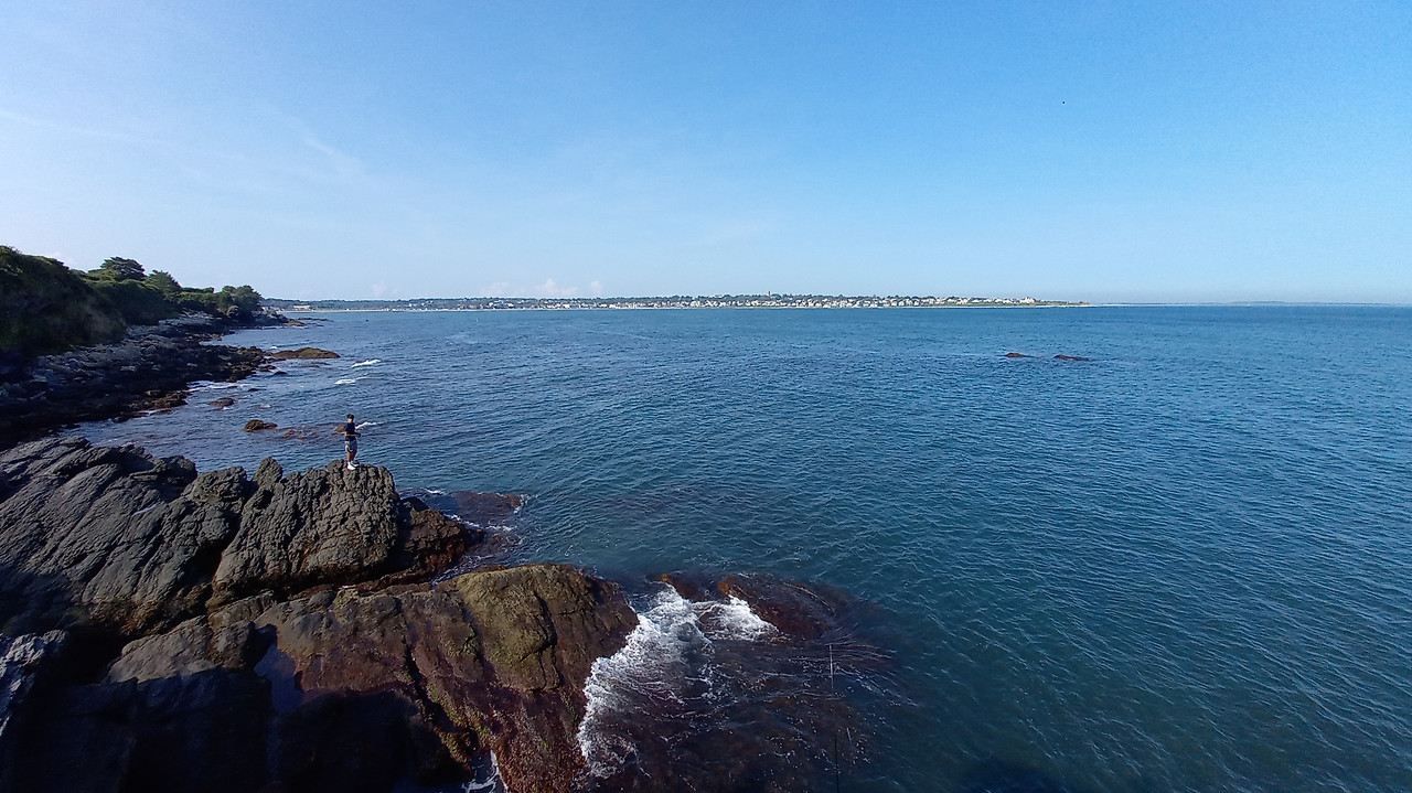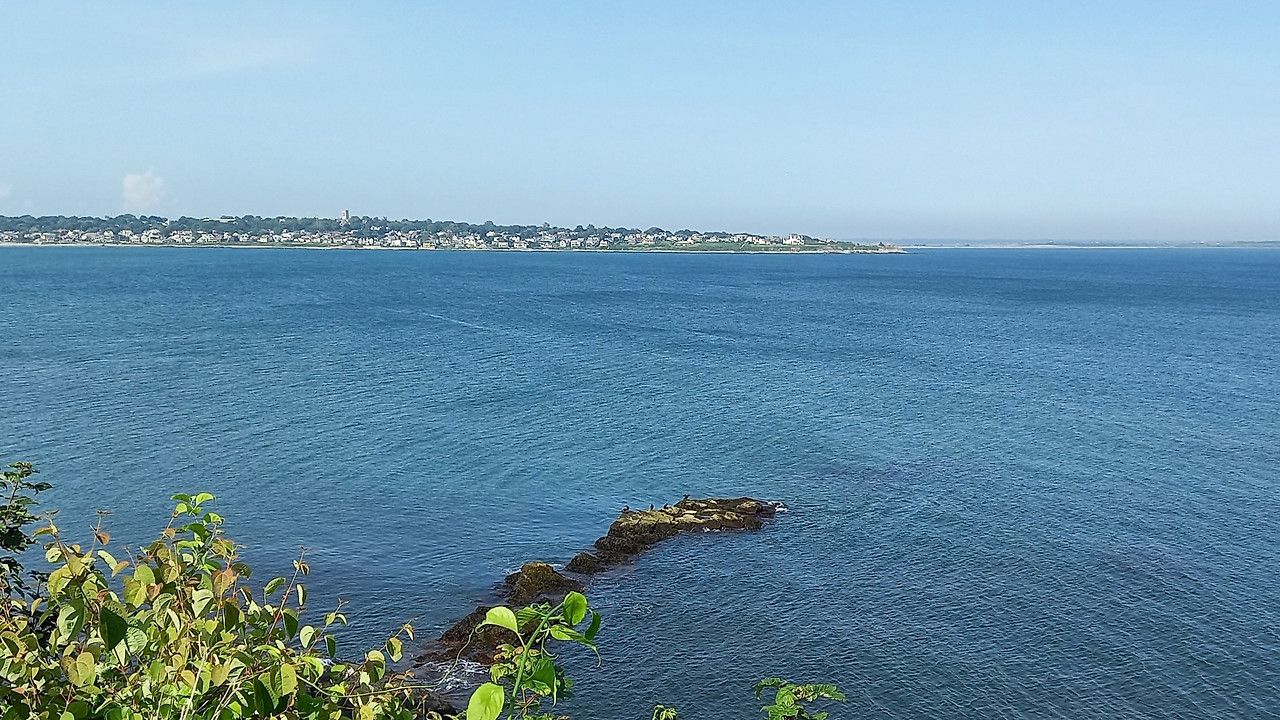 초록 나무, 바위 돌, 푸른 바다, 저 멀리 해변가 동네가 절경을 이룬다.