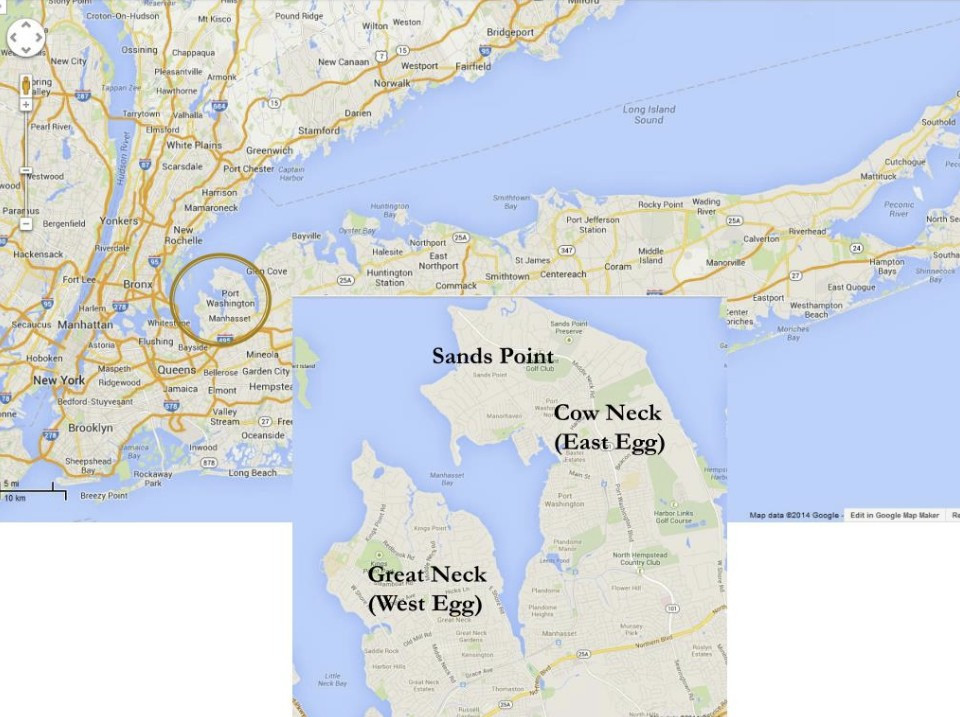 롱 아일랜드에 자리한, 위대한 개츠비 무대 West Egg (실제 지명 Great Neck)와 East Egg (실제 지명 Sands Point)
