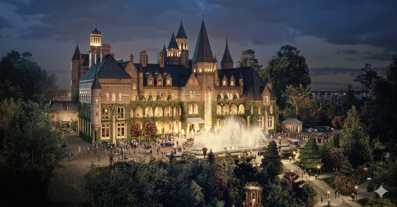 개츠비의 저택을 소설과 영화 등 여러 자료를 참고하여 AI가 그렸다.