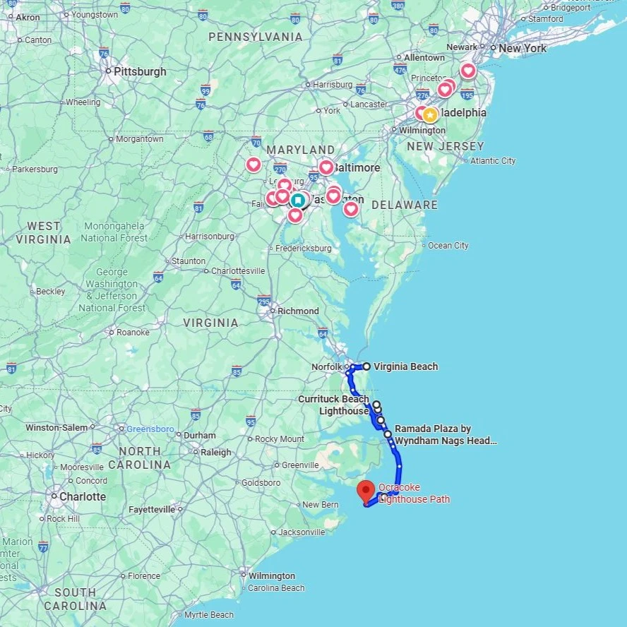 버지니아비치--> 커리턱 뱅크스 리저브 커리턱 비치 등대--> 코롤라 비치--> 아우터뱅크 모래섬--> 해터라스--> 페리를 타고 오크라코크 등대까지 가는 경로다.
