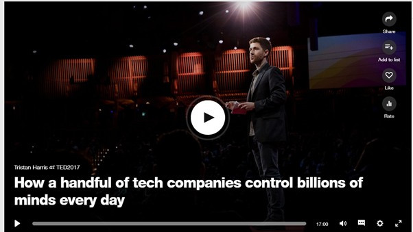 2017 TED talk에 초청되어 기술 거대 기업들이 어떻게 우리의 시간을 통제하는지를 역설한 트리스탄 해리스 (Tristan Harris, 전 구글 디자인 윤리 담당자)의 발표를 정리하면 다음과 같다.