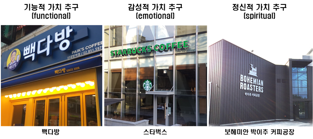 그렇지 않고 감성적 가치를 이 커피숍의 핵심 고객가치로 가져간다면 매장 인테리어나 분위기, 매장 점원들의 응대 방식, 고객 커뮤니케이션 등을 기존의 커피숍 대비 어떻게 차별화할 것인지에 대한 고민을 해야 한다.