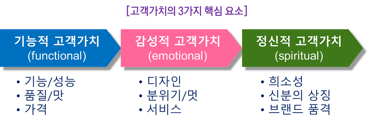 사람의 마음에 이성과 감성 그리고 지성이 있듯이 고객의 마음을 사로잡아야 하는 '고객가치'에도 이성을 설득하는 '기능적 가치'와 감성을 자극하는 '감성적 가치' 그리고 지성을 유혹하는 '정신적 가치' 이렇게 세 가지 핵심 요소가 있다.