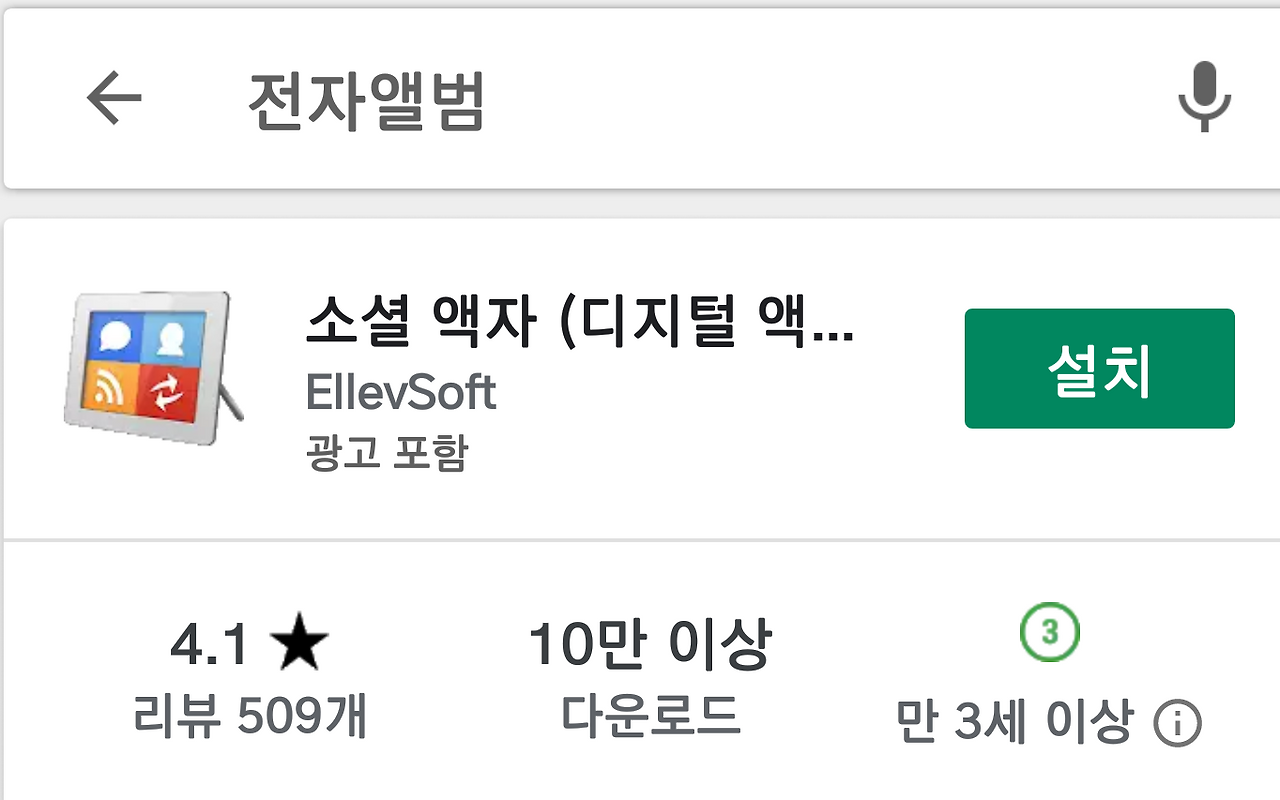 구글 플레이 스토어에 가서 '전자앨범'이라고 치면 쓸만한 무료 앱들이 많습니다. 아래에 대표적인 앱들을 몇 가지 올려 봅니다. 늘 그렇듯이 오늘도 아래 앱들 중에서 다운로드 숫자가 가장 많은 '소셜 액자'라는앱을 써 보기로 하였습니다. 저도 전자 앨범 만들기는 처음 해보는 것이라 다소 서투를 수도 있겠습니다.