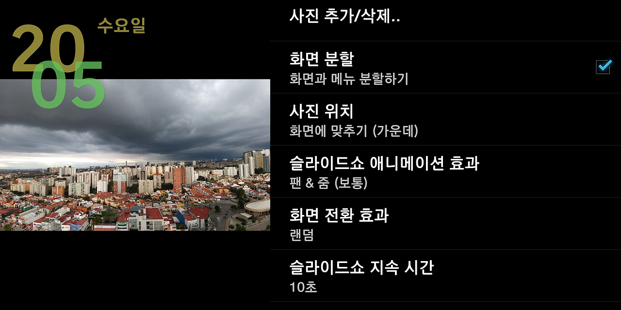 2) 설정 메뉴 맨 위에 '사진 추가/삭제'가 있는데 이 메뉴로 들어가서 스마트폰에 있는 사진 중에 본인이 화면에 띄우고 싶은 사진들을 선택합니다. 중고폰에 사진에 없다면 현재 사용 중인 스마트폰에 있는 사진을 먼저 중고폰으로 옮겨야 합니다. 이 과정이 어려울 수도 있겠는데 제일 쉬운 방법은 스마트폰에 있는 사진들을 PC로 옮겼다가 다시 중고폰으로 옮기거나 SD 카드를 이용할 수도 있습니다. 스마트폰 사용에 능숙하신 분이라면 블루투스나 와이파이를 이용해서 두 폰을 연결한 후에 사진들을 전송할 수도 있습니다. 그다음에는 파워포인트 슬라이드 쇼 하듯이 사진을 어떻게 화면에 보이게 할 것인지 '슬라이드 쇼 설정'을 하시면 됩니다.