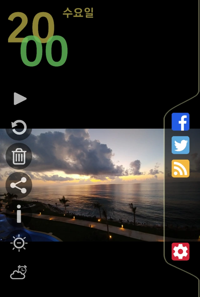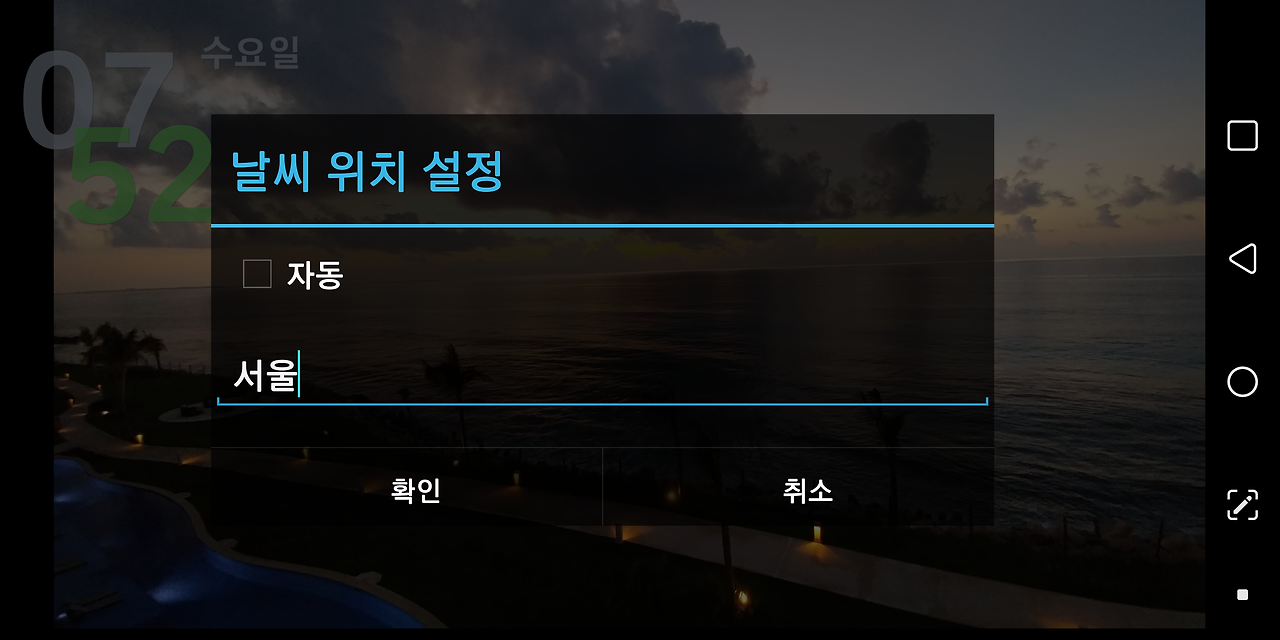 5) 화면 좌측에 현재 시간과 날씨를 띄울 수 있는데요. 사진에 시간이 뜨는 것이 눈에 거슬리면 메인 화면에서 바로 시계 기능 온/오프를 하실 수 있습니다.