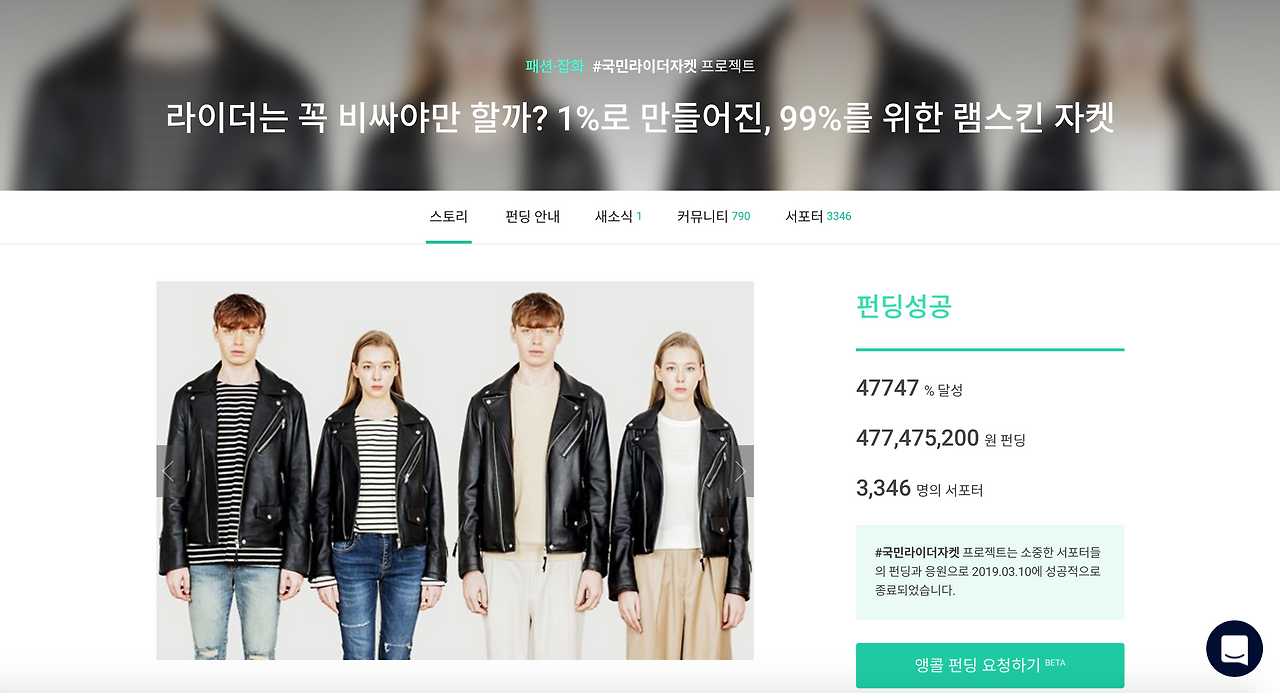 크라우드 펀딩 플랫폼이라고 이야기하지 않는다면, 그냥 가죽재킷을 판매하는 온라인 쇼핑몰이라고 생각할 것만 같은 비주얼이다.