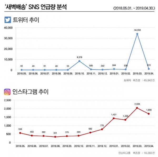 실제로 트위터나 인스타그램 등 SNS에서 '새벽배송' 언급량이 점차 늘고 있다.