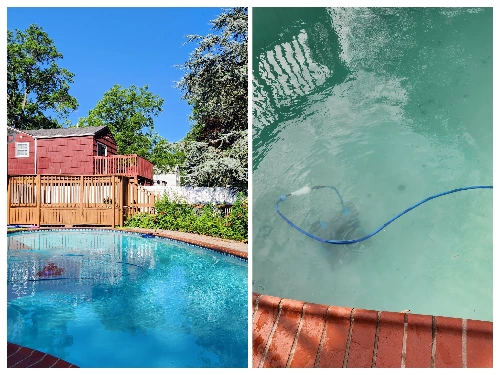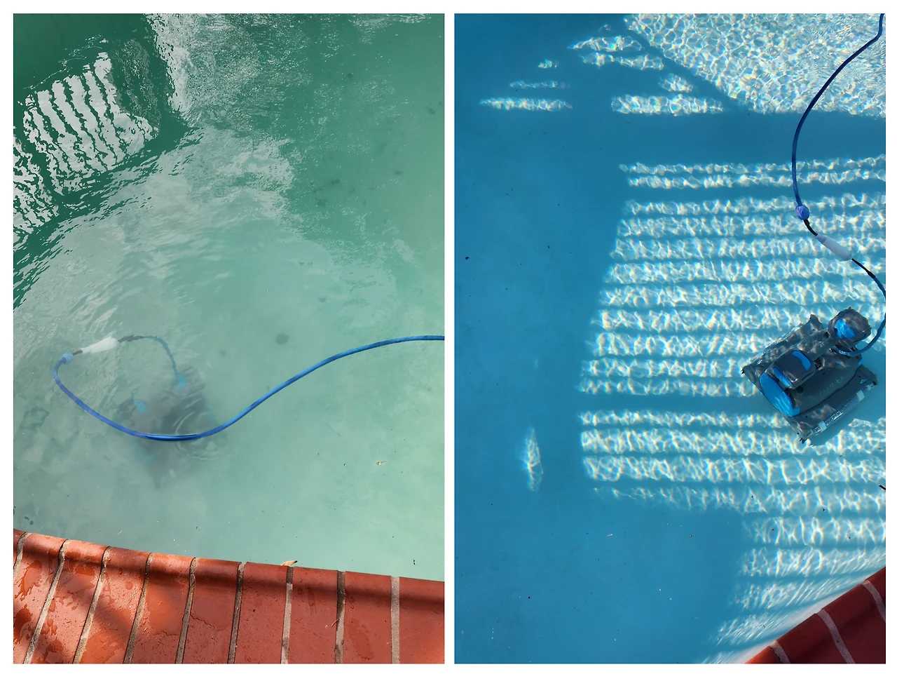 왼쪽이 정상 수질의 수영장. 오른쪽이 이번 주말 막 오픈한 수영장. 수영장 바닥을 청소하는 로봇 청소기가 바로 위에서도 잘 안보일 만큼 물이 더럽다.