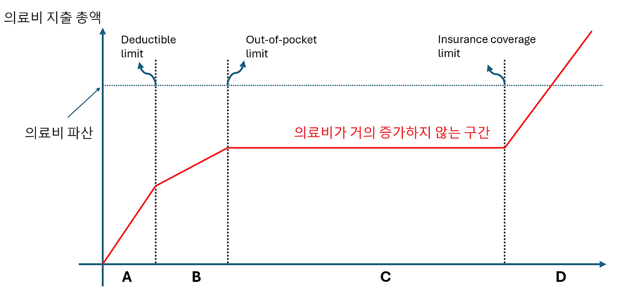 이 그래프에서 미국 의료비는 4개의 구간으로 설명할 수 있습니다. A는 Deductible 구간으로, 보험회사 지원 없이 환자가 100% 지불합니다. 환자 지불 금액이 B에 도달하면 이 때부터는 보험회사가 일부, 환자가 일부 냅니다. (보통 보험사가 80%를 냅니다.) 환자의 의료비 부담이 크게 줄어들지요. C부터는 보험사가 100% 지불합니다. 그래서 환자의 병원비 부담이 발생하지 않습니다. D에 이르면 보험사 지원을 기대하기 어렵습니다.(많은 보험들이 기본적으로 이 상한은 없지만 일부 상한이 있는 보험이 있을수도 있어서 이렇게 코멘트 합니다.) 그래프를 보면 아시겠지만 치료 초기의 병원비는 빨리 증가하지만 out-of-pocket maximum에 도달한 이후 미국의 경우 병원비가 거의 증가하지 않기 때문에 치료가 거듭되더라도 의료비 파산 위험이 함께 올라가지 않습니다. 정말 간단히 설명한거고 실제로는 좀 복잡한 상황들이 발생합니다. 예를 들어, Deductible 구간이라고 해서 환자가 청구액을 모두 내는 것도 아닙니다. 병원-보험사간 기본 할인은 전구간 적용이며 보험 plan에 따라 일부 치료나 검사는 deductible 구간이어도 보험사가 지불합니다. 제가 처음 예시로 든 병원 청구서 역시 deductible limit 도달 전이었지만 보험사 plan 에서 비용을 지불해서 저는 병원비가 발생하지 않았습니다.