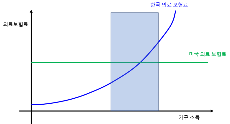 한국의 건강 보험은 공공의료 혜택의 효율적인 확장(모든 소득 계층에 동등한 의료 혜택을 제공하지만 개인의 선택에 따라 비용을 더 지불하는 대신 상대적으로 더 고품질의 의료 서비스 받을 권리도 보장하는)을 추구합니다. 쉽게 말해 국가가 개입해서 소득에 무관한 의료적 평등을 추구하지만 더 나은 의료 서비스에 대해서도 길을 열어두고 있죠. 이를 위해 선택한 방법이 고소득층으로부터 보험료을 더 받아서 저소득층을 지원하는 방식입니다. 그래서 한국 건강 보험은 소득에 비례해 매달 내는 건강보험료가 올라갑니다. 일종의 사회 보장 제도이자 세금이라고 봐도 되는 건 이런 이유입니다. (연봉이 1억5천 정도 되는 직장인이라면, 본인이 내는 건강보험료는 월 50만원 정도 됩니다. 회사가 50%를 내므로 실제로 건강보험공단에서 받는 보험료는 100만원이 되겠죠. 결코 적은 금액이 아닙니다.)