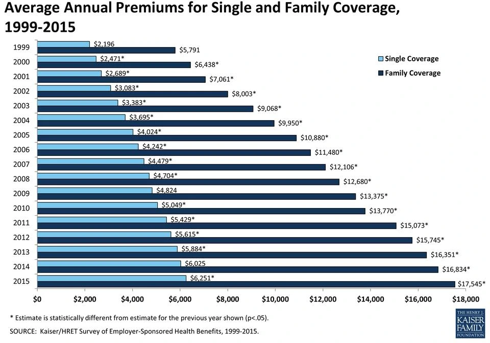 대답하기 어려운 질문입니다. 민간 보험인 만큼 보험사마다 다르고 plan마다 다르고 심지어 본인이 전부 내는 사람도 있고 직장에서 분담해서 내는 경우도 있습니다. 한국도 직장인들은 실제 보험료는 자기가 내는 돈의 두배지만 그렇게 인식하지 않고 있죠. 어쨌든 혼자 다 지불하든, 회사와 나눠서 내든, 회사가 다 내주든 상관없이 보험사에 최종적으로 납입되는 보험료는 아래 그림에서 보듯이 온가족을 커버하는 plan의 경우 월평균 $1,462(= $17,545/12개월)이고 자기 자신만을 커버하는 plan은 월평균 $520 을 지불합니다. 이게 2015년 자료니까 글을 작성하고 있는 2020년 기준으론 더 올랐을거라 봅니다. 일반적으로 직장이 있으면 회사가 이중 일부를 부담해 줍니다만 그렇더라도 한국하고 비교하면 금액이 정말 무시무시하죠? 그런데, 의료 보험 프리미엄(가입을 위해 매달 내는 돈)은 그 폭이 정말 넓습니다. 평균 근처에 모두 몰려 있다고 생각하시면 안됩니다. 고등학교때 배운 통계를 가져와 설명하면 '분산' 이 정말 크다고 말씀드릴 수 있겠습니다. 일시적으로 직장을 잃어 구직 상태에 있는 사람을 위한 Bridge 보험의 경우 2년간만 이용할 수 있는 대신 매우 저렴하며(심지어 특정 조건을 만족하기만 하면 매월 내는 프리미엄도 무료인 경우도 있습니다. 정부 보조가 아닌데도 말이죠), 아이들만을 위한 보험은 조건이 좋은데 비용은 거꾸로 엄청나게 저렴하기도 합니다. 또한 out-of-pocket maximum을 높게 설정하는 대신 매월 내는 보험료는 극단적으로 낮춘 보험도 있습니다. 반면에 $2000 이상 프리미엄을 매달 내지만 out-of-pocket maximum이 $0 인 보험도 있습니다. 이런 보험은 가입자는 아예 병원비를 내지 않습니다. 어떤 진료를 받더라도 보험회사에서 다 지불하는 거죠.