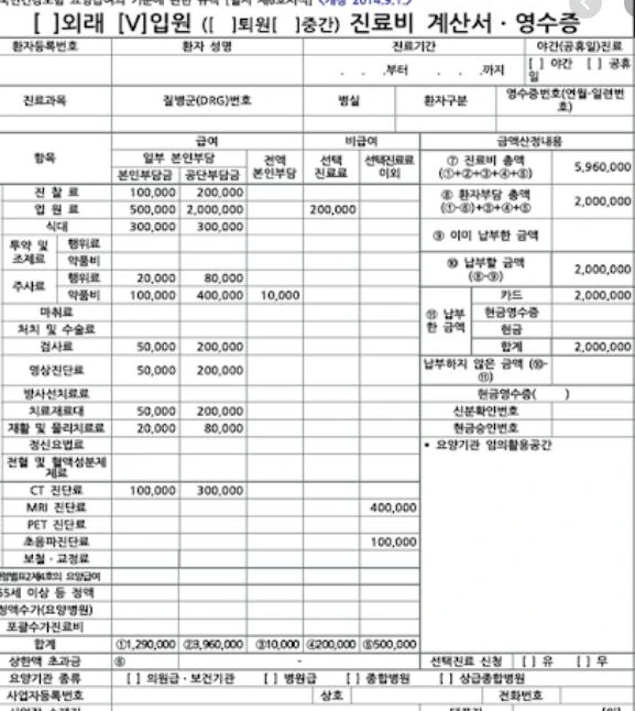 아래는 한국 병원비 영수증 예시입니다. 전체 병원비는 596만원이 나왔고 건강보험 급여 지원을 받은 덕분에 환자 본인은 200만원을 지불했습니다.