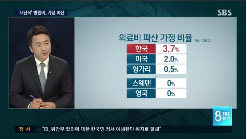 한국 언론을 통해 보도된 2017년 OECD 발표 자료를 인용해서 이야기 하자면, 한국이 미국보다 의료비로 인한 파산 비율이 두배 가까이 높습니다(2% vs 3.7%) 한국이나 미국 모두 다른 선진국에 비해 의료비 파산 비율이 높으며 미국보다 한국이 더 높습니다. 한국이 흔히 이야기 하는 의료 천국이 아닌거죠.