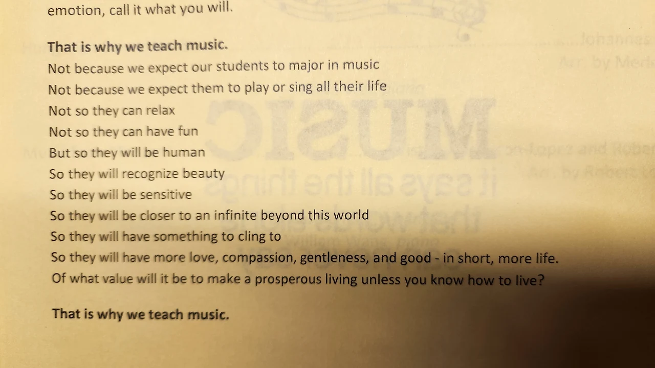 공연 팜플렛의 첫 페이지. 아이가 음악을 배움으로써 아름다움을 인지하게 될 것이라는 문장이 저는 너무나 마음에 들었습니다