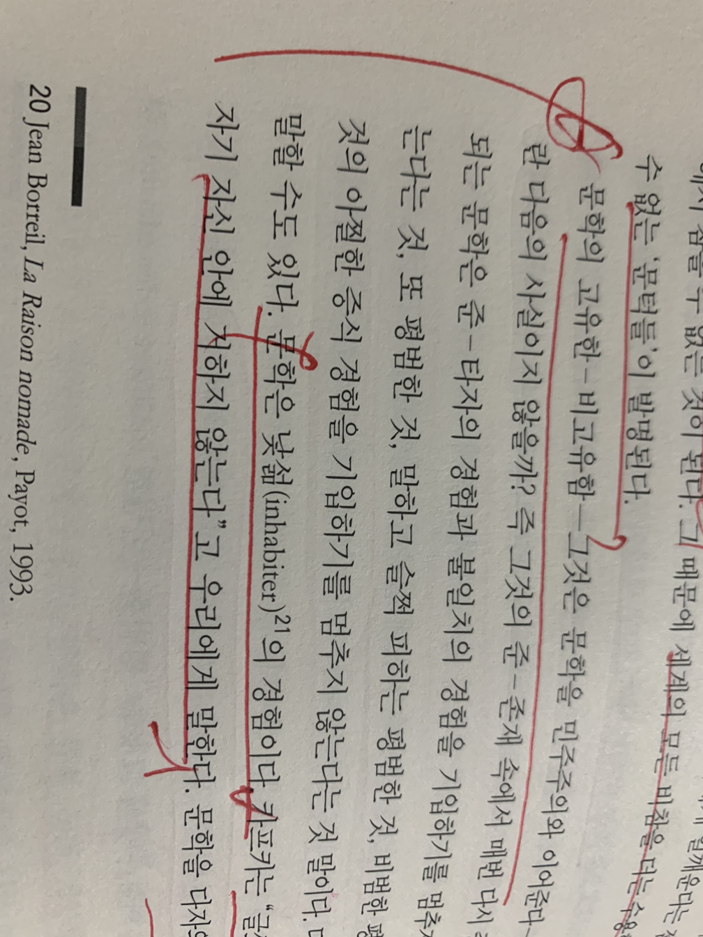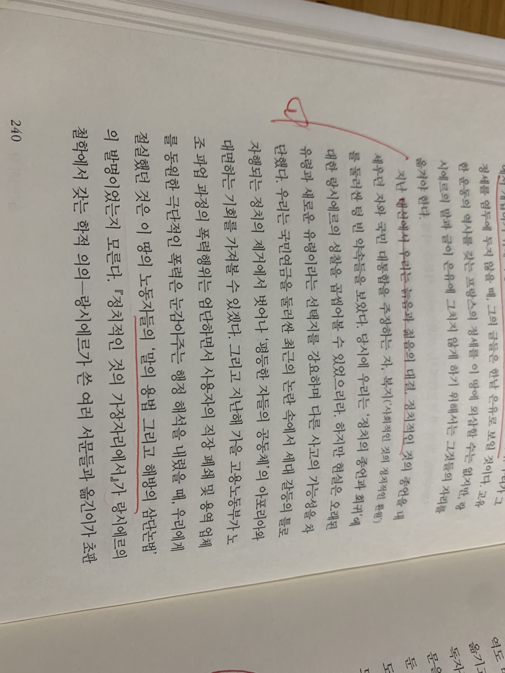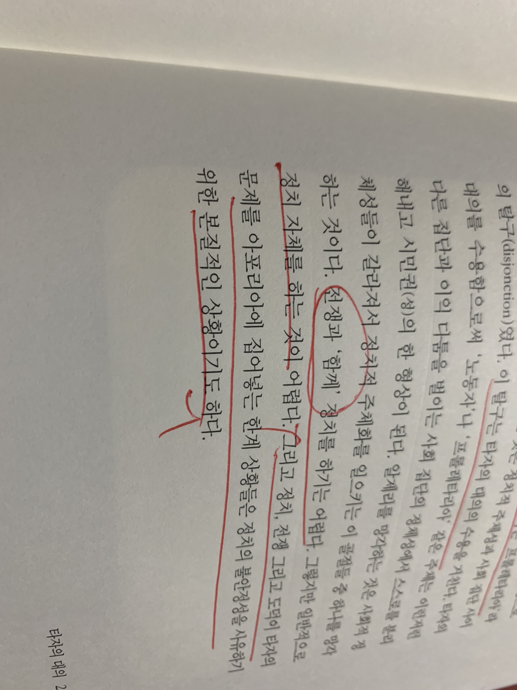 그러므로 자끄 랑씨에르 의 '정치' 란, 이것이다 저것이다 규정되는 것이 아닌, 단지 어느 범주에서부터 어느 범주까지 걸쳐지는 내용에 더 가깝다. 거대한 해운도시국 아테네의 시민들에게 정치란, 이 해안에서 저 해안으로 건너다니는 거대한 배와 같은 개념이기에, 그러한 심상을 공유하는 이들은 아테네의 정치를 좀 더 손쉽게 규정할 수 있다. 그러나 바다나 항해를 모르는 이에게 아테네의 정치 체제는 훨씬 더 어렵거나 낯설고 생경하게 느껴질 수 있다. 그러므로 자끄 랑씨에르는, 현대에서 정치와 동일한 의미로 사용되는 듯한 민주주의를 예로 들며, 민(民)에 해당하는 수많은 사람들과 계급이 있을텐데, 그들의 뜻을 모두 반영한다는 것이 과연 가능한 일인지를 되묻는다. 그러므로 다수결은 사실상 거대한 합의의 허상이자 폭력이며, 모든 개인과 계급의 뜻을 온전히 반영할 수 없기에 저자가 젊었을때부터 겪은 정치란, 곧 계쟁- 즉 계급 투쟁의 불화 그 자체였다고 고백한다. 그러므로 정치는 마치 내가 그토록 흠모해온 공부자의 통치술처럼, 투명한 이상을 아름답게 실현하는 것이 아니라 여러 불화들을 생활의 공간으로 끌고 들어오는 일이다. 그렇다고 해서 합의는, 저자가 생각하기에 결코 두 계급의 원만한 중도라기보다, 차라리 정치를 소멸하고 제거하는 일이라고 생각한다. 그가 생각하기에 정치는, 두 투쟁이 끊임없이 반복되거나, 두 계급의 이익이 모두 온전하게 반영되어야 하는 일이라고 생각하는 듯하다.