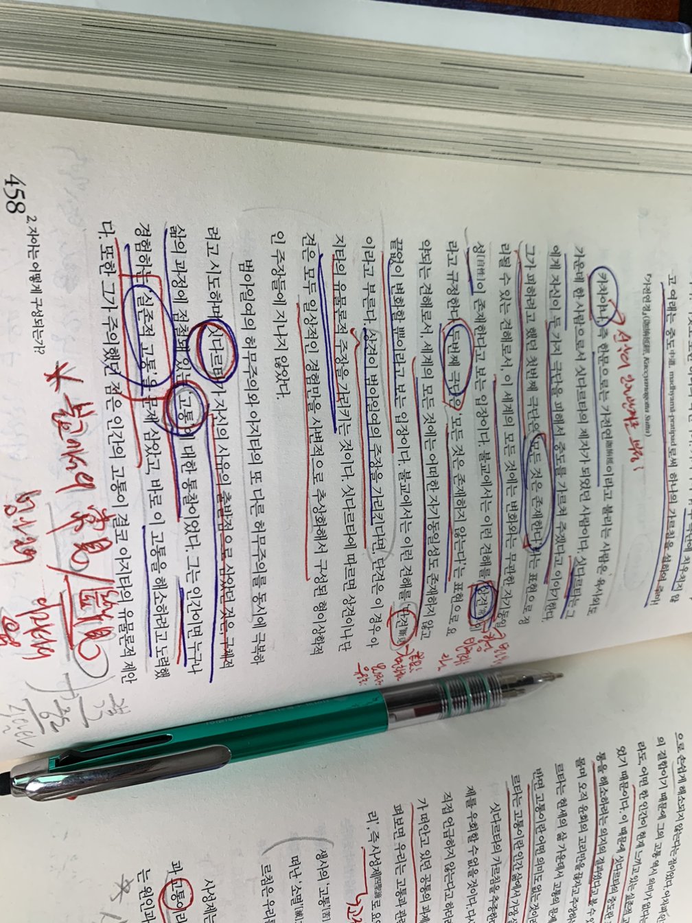 다만 매번 같은 기술을 연습한다 해도 숙련도에 따라 그 의미를 좀 더 깊고 넓게 깨달아가듯이, 모름지기 좋은 책은 반복해서 읽을수록 마치 좋은 술과 같아 지루하긴커녕 오히려 더욱 새롭게 재미나게 읽힌다. 나중에 다시 얘기하겠으나 카카오톡이 불통이라 전국이 들썩이던 어느 주말에, 마침내 아내가 나를 구출하여 모처럼 호젓이 반나절 서로 한가해진 우리 부부는, 각자의 일에 몰두했는데, 나는 이 때다 싶어 충분히 훈련을 하고, 씻은 다음 다시 철학VS철학을 꺼내들었다. 사실 언젠가 이 책들을 인쇄소에 가져가서, 전부 인물별로 나누어 떡제본으로 꿴 다음, 필요한 부분만 쏙쏙 들고 다니고 싶은 마음이지만, 지금 당장은 그럴 수가 없는데다, 웬만한 목침만한 책 두 권을 모두 짊어지고 다닐수도 없으니(신판이라고 해서 구판의 내용을 모두 포함하는 건 또 아니라서 결국 두 권을 모두 읽어야 한다.) 결국 집에서 여유가 있을때 몰아서 읽을 수밖에 없다. 소설책처럼 배 깔고 편히 볼 수 있는 책도 아니고보니, 늘상 색색 볼펜을 준비하여 내용을 읽곤 하는데, 그 때 내게 모처럼 치받아 달려오는 문장이 또 그럴듯하였다. 강신주 선생은, 늘 본인의 단호한 말씀처럼, 우리는 단순하게 정규 과정에 편입되어 어느 철학자의 글만 읽는 '철학' 을 배우는 것이 아니라, 그 철학의 소재를 가지고 내 삶을 증명하고 설명하는, '철학함' 을 배워야 한다고 하였다. 나는 오래토록 그 문장에 밑줄을 긋고 곱씹고 있었더랬다.