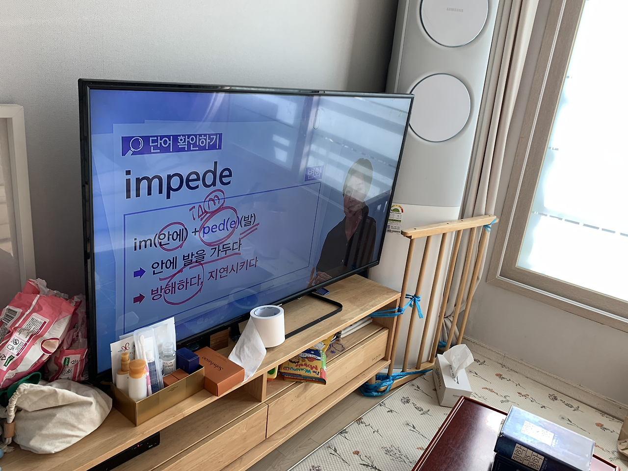 앞서 적었듯이, 갑자기 날씨가 곤두박질하여 옥상도장에서 연습하기 어려웠다. 옛 선조들께서는 몸이 움직이기 좋은 계절에 활을 쏘고 말을 타며 단련하시었고, 안으로 들어앉아 지내야할 계절에는 글을 읽어 마음을 살찌우셨다. 그러므로 보통 문과의 별시는 겨우내 글을 읽은 선비들을 위해 봄을 넘겨 이루어졌고, 무과는 여름내 땀 흘린 장정들을 위해 가을에 주로 열렸다고 했다. 그러므로 나는 추운 날에 여유가 있으면 일단 뉴스든 영화든 교육방송이든 무엇이든 틀어놓고 주로 간단한 기본 기술과 맞서기 기술, 그리고 주로 무게를 다루어 공간을 많이 차지하지 않는 연습을 하였다. 아침에는 주로 교육방송을 쉼없이 틀어놓아 영어든 중국어든 듣고 따라하는 편이다. 아무래도 집에서 혼자 훈련을 할때면, 늘상 보던 살림살이들이 자꾸 주변에 있어 훈련에 집중할 수 없는데, 나는 한동안 이를 핑계라고 여겨 스스로 책망하다가, 나중에서야 그 유명한 김영하 선생께서, 유명한 작가들이 굳이 제 집을 놔두고, 집필실을 따로 마련하거나 호텔방에서 글을 쓰는 이유는, 늘상 자신의 몸에 엉겨붙은 익숙한 환경에서 벗어나, 낯선 곳에 스스로를 던져두는 행위라고 하여 놀랐던 바 있다. 하기사 단련기구 이외에는, 오로지 같은 도복을 입은 사형제 사자매들이 가득한 도장과, 살림살이가 들어찬 집은 환경이 다를 수밖에 없다. 그러므로 나는 기왕 팔 정신을 생산적으로 꽂아넣기 위해 외국어 교육방송을 읊조리며 훈련하였다. 마침내 서산에 도장을 여신 '열혈남아' 서산 사범님께서는, 우리를 지도하실때 발을 손처럼 능란하게 쓰기 위하여 여름이면, 커다란 선풍기는 몇 대씩 갖다두고, 발을 위아래로 돌리며 선풍기의 둥그런 외곽선에 닿지 않도록 유지하는 연습을 시키셨고, 또 본인도 늘상 자주 하시었다. 나는 감히 그 정도 실력은 될 수 없으며, 못을 몇 개씩 박아 절름대는 발로 오묘한 태권도의 묘수를 다 펼칠수는 없으므로, 발차기보다는 손기술에 더 주력하는 편이지만, 그래도 안할 수는 없는 연습이라, 나는 교육방송을 틀어놓은 TV 위쪽으로 계속해서 발을 날리는 연습을 했다. 만약에 발이 혹시나 낮아지거나 빗나가서 TV에 맞기라도 하면 몇백만원짜리 대형사고...ㅠㅠ