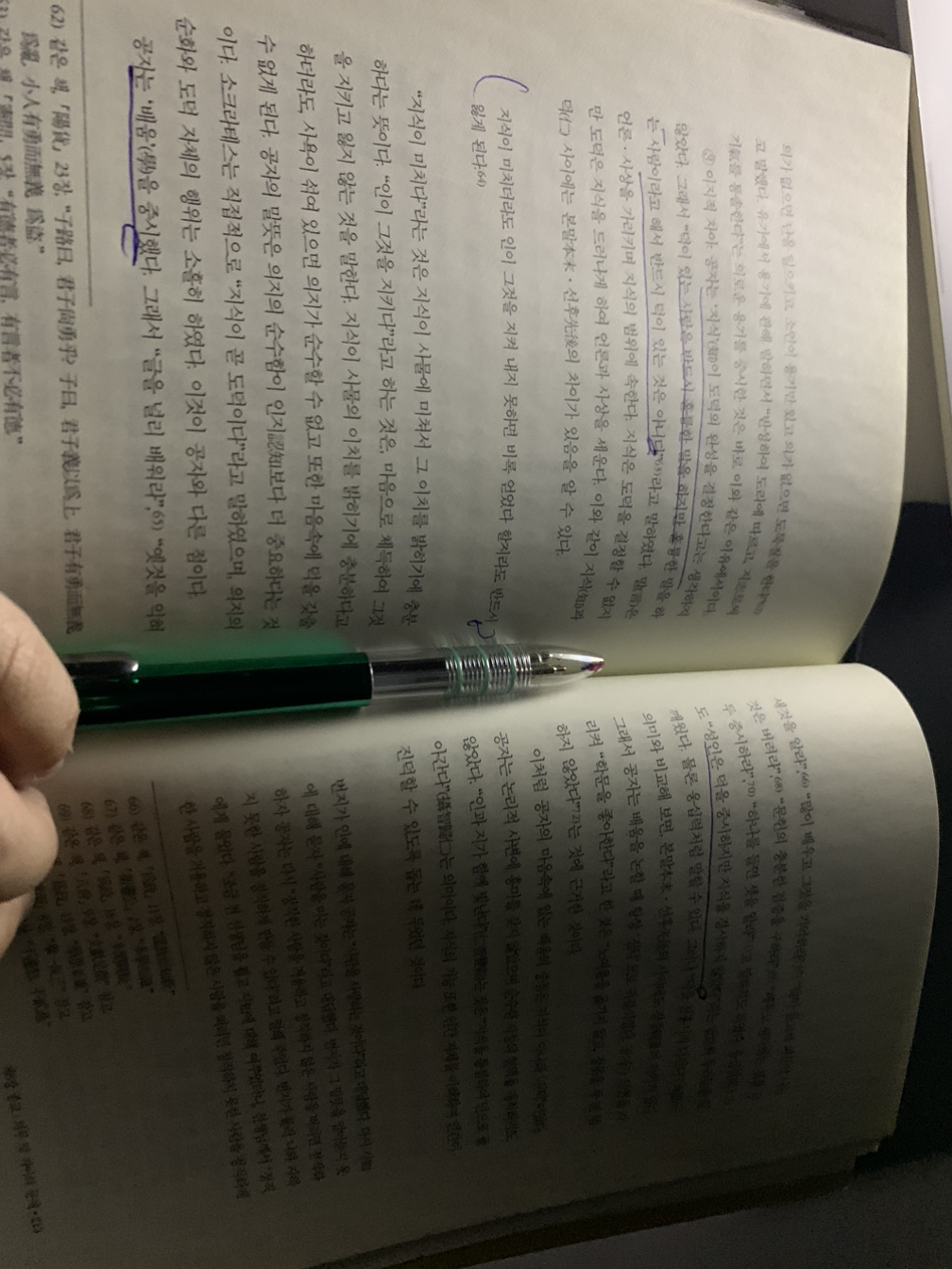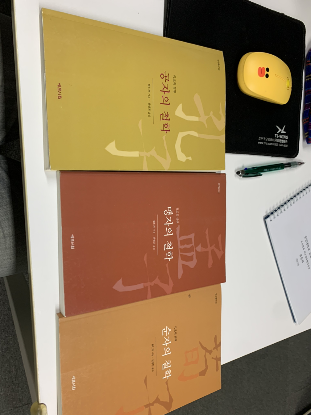 앞서 말했듯이 강신주 선생의 철학VS철학 신/구판은 목침 두 개만 하여 도저히 가방 안에 다 넣고 다닐 수 없었다. 내 가방 안에는 이미 언제 도장에 갈지 모르므로 속옷과 수건, 주먹보호대, 숙취해소제를 비롯한 간단한 상비약(^^;;), 그리고 항시 읽을 책이 있다. 제아무리 전화기에 재미있는 것들이 많다 해도 그렇다. 그러므로 얇은 책 무엇을 가지고 갈까 고민하다 오래전부터 다시 읽지 못한 채인후 선생의 공맹순 철학 3부작을 골랐다. 대만에서 오랫동안 신유학을 강의해온 채인후 선생은, 책 곳곳에서 드러나는 자부심이 그렇듯, 유학이야말로 중국문화뿐 아니라 인류를 대표하는 학문이자 종교라고까지 강변하시는데, 이 책은 그런 유학의 중요 인물 및 요소를 정리하고 간단히 알리고자 원래 한 권의 책으로 구성되어 출판되었다고 들었다. 그의 제자 중 한 분이신 천병돈 선생께서 원 저자의 허락을 받고 이 책을 인물별로 다시 나누어 공자의 철학 / 맹자의 철학 / 순자의 철학으로 각각 출판한 것인데, 겉보기에는 얇아보이지만, 인용된 문헌이 많고, 행간이 촘촘해서 이백여 장 읽는데 하루 반나절 꼬박 걸렸다. 그러나 명색이 유학을 공부한 몸으로서, 공맹순의 철학은, 마치 태권도의 기초 동작을 익히는 교본을 보듯 반드시 봐야할 책이다. 채인후 선생의 강렬한 자부심만 걷어내면, 이 책은 끊임없이 반복의 반복이라고 할 정도로, 세 인물의 문헌과 경구의 인용, 중요 단어 등을 볼 수 있다.
