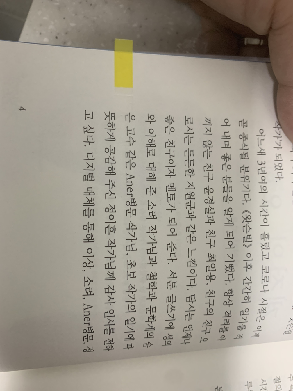 글을 쓴다는 일조차 여유로운 일은 아니다. 옛날 시인이나 수필가들처럼 문득 일상 속 흐르는 단상을 잡아 음풍농월하며 쓴 글을 현판으로 걸거나 후세가 자연스럽게 발굴하여 문집으로 엮어주던 시대는 진작에 지났다. 이제는 출판사와 여러 번 회의를 거치며 원고를 다듬고, 반드시 '나의 온전한 생각만을' 글로 전할 수 있다고는 말할 수 없게 되었다. (라고 알고 있다. 나도 어디까지나 들은 얘기다. 내가 다른 작가분들처럼 뭘 출판을 해봤어야 알지 ㅠ) 그러므로 작가는 결코 게으르거나 늘어지는 이가 있다. 게으르거나 늘어지는 이는 걱정조차 하지 않는다. 그 어떤 일상 속에서도 작가는 항상 생각하고 고민하였다. 그러므로 문장을 쓸 수 있다. 제목에 대한 고민이 깊었던 이전 책보다, 훨씬 더 편하게 녹아들듯 다가오는 책을 선물하시어 다시 한 번 감사드린다. 난 대체 뭘 드리지...