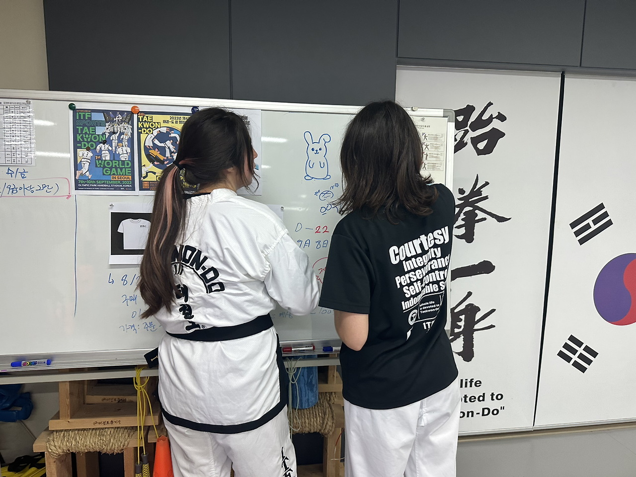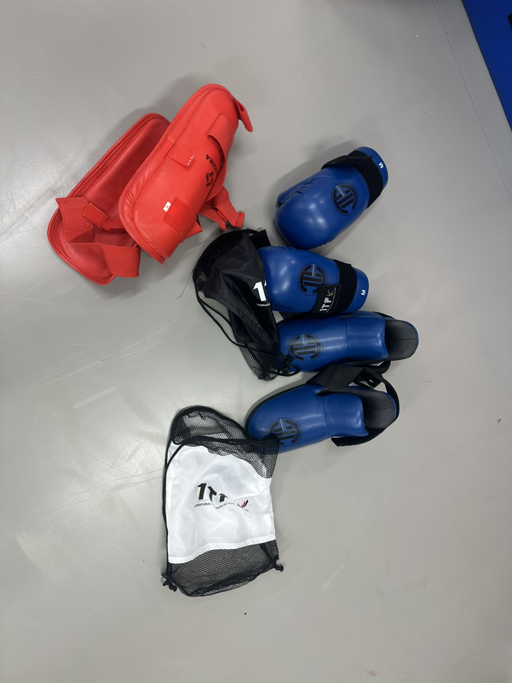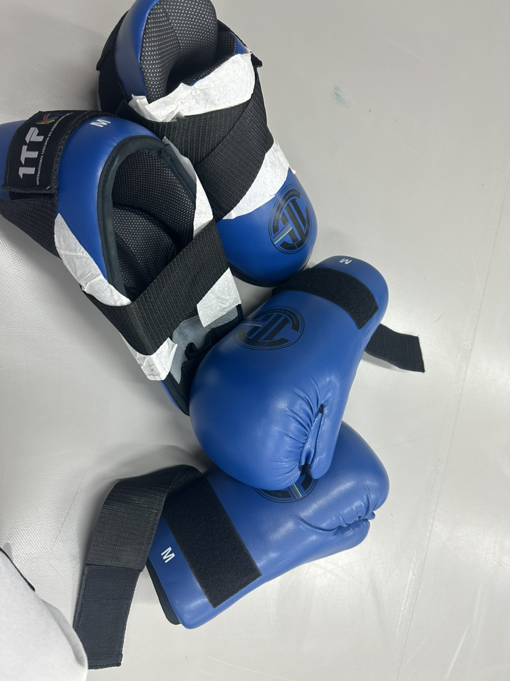 인생이란 역시 사소한 내용조차도 한치 앞을 모른다. 모처럼 저녁 훈련 시간, 보고싶던 사범님, 콜라 부사범, 사자매 사형제들과 함께 틀과 보 맞서기 준비나 좀 하다 집에 가렸더니 웬일. 모두.반가워도 해주었지만, 이번 대회 공식 맞서기 장비가 도착했다. 매듭 부분을 교차해서 묶는 발 보호대야 익숙하지만, 엄지손가락 및 네 손가락 끝만을 살짝 넣는 글러브는 평소에 쓰던 권투 글러브와 달리 손을 편안히 감싸주기 보단 정권 형태를 만들기 위해 손을 항상 오므려줘야 하고, 타격 부위가 비교적 얇아서 헤비백을 치는 단련이나 연습용으로는 어울리지 않고 정말로 득점제로 싸우는 태권도식 맞서기에 적합했다. 주먹으로 연타하기 어려우니 발차기도 좀 더 폭넓게 쓸 수 있다. 남녀노소, 심지어 내외국인을 안 가리고 젊은 사제사매들은 장비 크기 맞춰보느라 손발에 끼어보더니 역시 맞서기가 하고 싶은지 다들 한번씩 연습해보고 싶어했다.