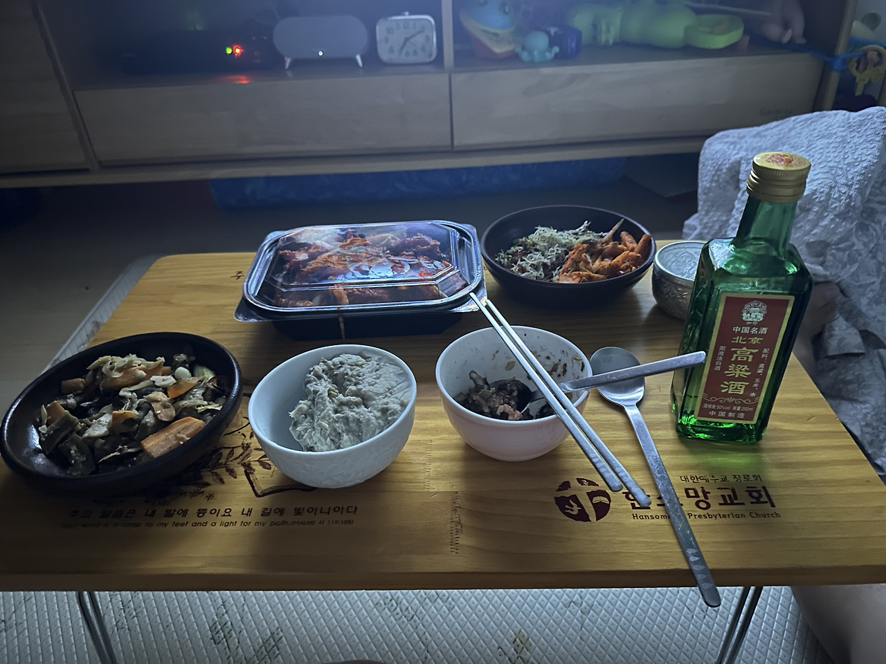잠이 많은 아내는 함께 운동회를 다녀와 꾸벅꾸벅 졸더니 마침내 잠들었다. 나는 책을 읽으며, 소은이를 돌보다 소은이도 일찍 일어나 푸지게 먹고 놀고 마침내 지쳐 이른 잠을 자기에 뉘어놓고 빨래와 설거지를 해놓고, 티비 불에 비춰 이제야 한 잔 한다. 수요일 혹은 금요일마다 한번씩 오시는 홍어무침 어르신은 비슷한 사투리를 쓰는 나를 귀여워하셔서, 아따, 큰 눔으로 하나 줘야제, 하며 삭히지 않은 살점을 입에 넣어주시었다. 갓 무친 홍어에 멸치볶음, 진미채, 소은이가 먹다남긴 밥과 녹두죽, 불고기, 성찬이다. 술 한 잔 마시고 말랑말랑해진 머리에 책 읽으면 그렇게 기분이 좋다. 삶은 늘 힘들지만, 처자식 덕분에 행복하다.