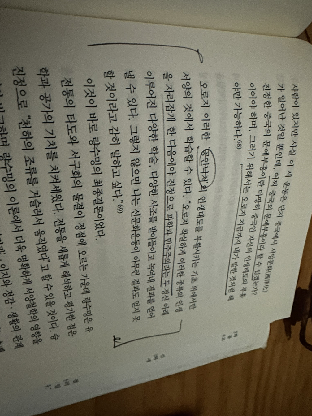 저 고아하신 영문학자 정 선생님은 영문학에 능통하실지 모르나 나는 한때 논술 강사도 했다는 녀석이 여전히 글을 편중하여 본다. 한때 모옌이네 위화네 유명 중국 작가들이 서점 서가를 수놓던 적도 있으나 나는 얼마 읽지 못했고, 여전히 잘 모른다. 모택동의 하방정책 이후로 많은 인텔리겐챠들이 초원과 논밭으로 낙향했으며, 어떤 이는 울분과 분노를, 어떤 이는 새로운 세계에 대한 희망과 환희를 써냈는데 그 유명한 늑대토템 도 이 시기를 회상하며 쓰인 작품이다. 즉, 순수문학 이라는 단어나 분류가 지금도 남아 있을지 모르나 어찌 되었건 문학은 언제나 늘 시대를 대변하는 이야기꾼이다. 그러므로 중국의 철학을 겉핥기로나마 전공은 했으되, 그 시대를 살아보지도, 그때의 이야기를 읽어보지도 못한 나는 당연히 이택후 선생의 5.4 신문화 운동 당시의 문예 일별 一別 (어느 특정한 주제에 대해 적는 글 )에 대해 이해할수 있을리 없다.