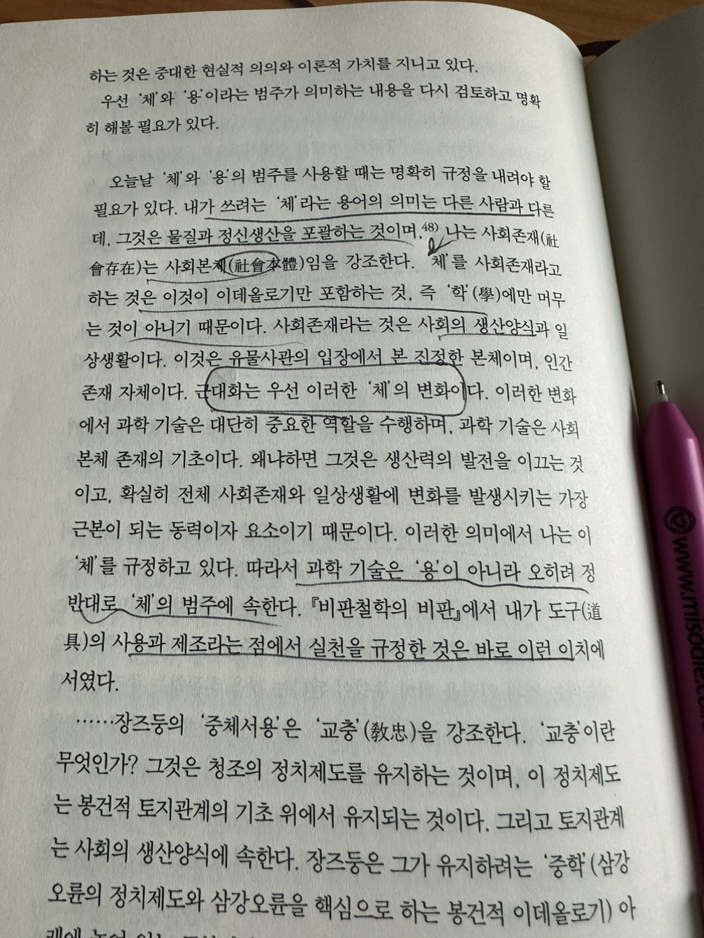 이택후 선생은 최후의 결론에 중체서용 이 아닌 서체중용 을 말했다. 그가 말하는 체 體 란 지금껏 중체서용 의 전통에서 강조되었던 정신이나, 사상, 사회적 방향을 의미하지 않는다. 그 스스로도 의미가 다르다고 전제하였으며, 그의 체 는 사회적 구도와 제도를 의미한다. 즉, 이미 서구화된 사회와 문명양식, 생산수단의 영향을 받는 현대인들에게 동양적 사고방식으로 생활의 중심을 두라고 하기엔 무리가 있다. 그러므로 서양식 사회방식에서 동양철학의 실천적 용도를 찾아야 한다는 것이 이택후 선생의 사고방식이다.