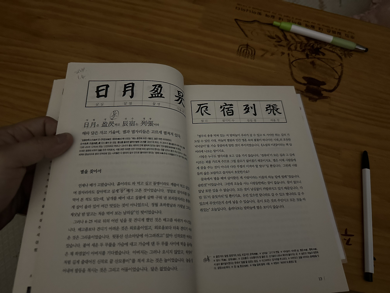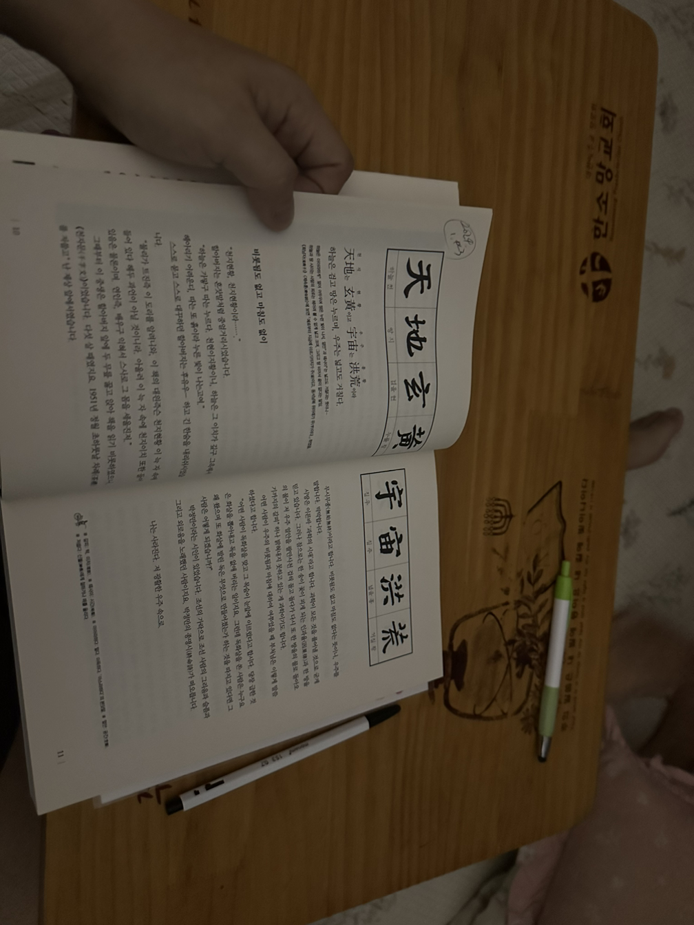천자문은 누구나 한자 하면 떠오를 정도로 가장 기본적인 교과서로, 그야말로 한자계의 바이엘이다. 양나라 무제가 주흥사를 시켜, 명필들의 글씨 중 서로 다른 글씨 1천자를 골라 8언절구로 꿰어맞추라는 설이 일반적이다. 이 때 천자문을 실제로 처음 쓴 이가 누구인지는 명확치 않다. 그 유명한 왕희지란 얘기도 있고, 위나라의 명필 종요나, 혹은 기 개념을 만들어 불교와 도교에 맞서는 유교적 형이상학의 기틀을 잡은 장제라는 이야기도 있다. 우리나라에는 누가 뭐래도 석봉천자문이 유명하다. 나도 어렸을때 석봉 천자문의 글씨로 한자를 배웠다. 지금 내가 보는 천자문 책은 그 유명한 충청도의 천재 김성동 선생께서 쓰고 주석을 단 천자문인데, 많은 도움이 된다. 능청스러우면서도 예민함을 숨길 수 없는 날카로움으로 주석을 달았다. 오늘은 가볍게 하루 8자 정도 시작하였다. 천지현황 우주홍황 일월영측 진수열장. 하늘은 검고 땅은 누르며 우주는 넓고 거친데, 해와 달은 차고 기울기를 반복하고 별자리는 아득하게 펼쳐져 있다. ITF태권도의 첫 틀이 천지 이고, 성경도 태초에 세상을 만든 일부터 시작하듯, 천자문도 그러하다. 하루 조금씩 해볼 일이다.