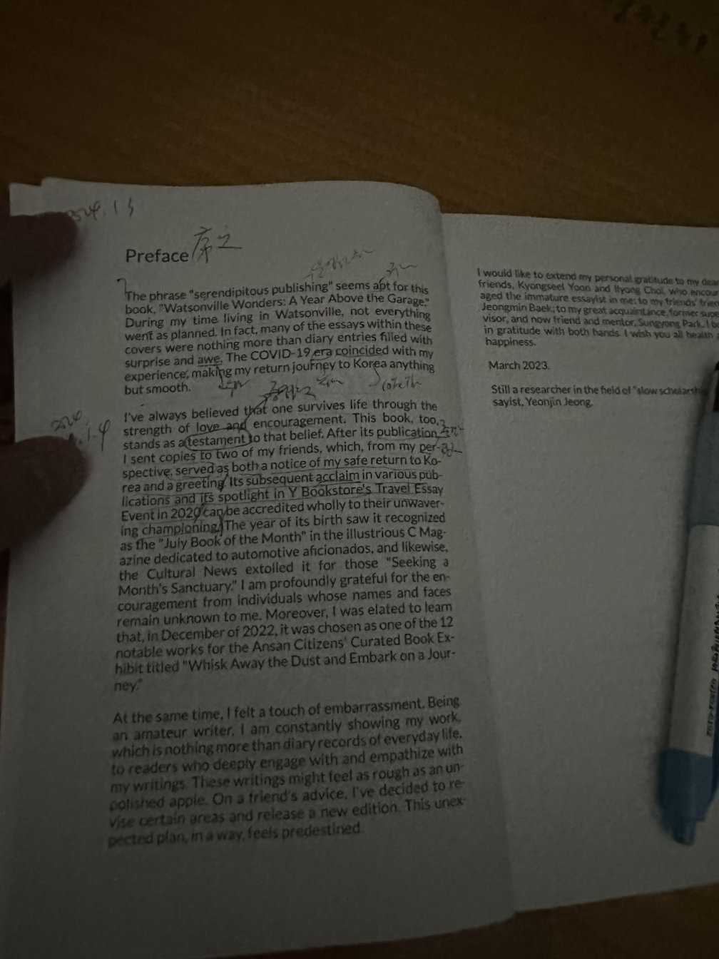 I've always believed that one survives life through the strength of love and encouragement. This book, too, stands as a testament to that belief. After its publication, I sent copies to two of my friends, which, from my perspective, served as both a notice of my safe return to Korea and a greeting. Its subsequent acclaim in various publications and its spotlight in Y Bookstore's Travel Essay Event in 2020 can be accredited wholly to their unwavering championing