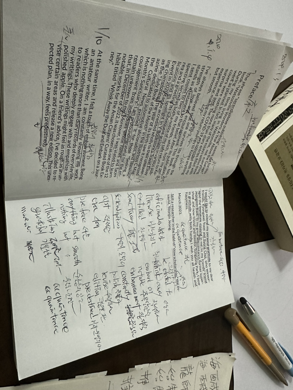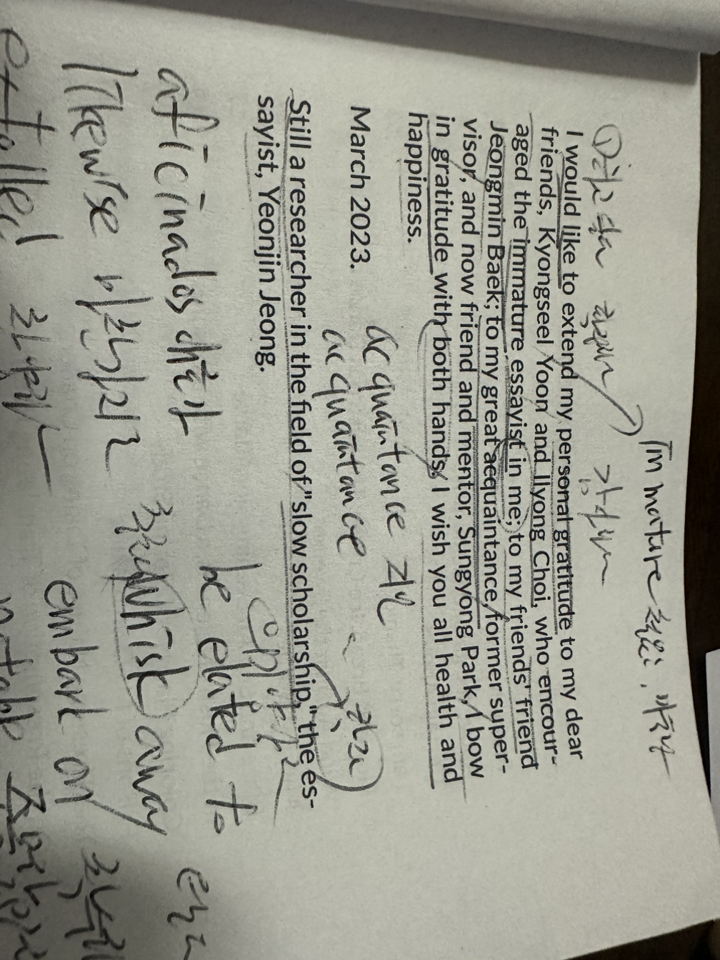 I would like to extend my personal gratitude to my dear friends, Kyongseel Yoon and llyong Chol, who encouraged the Immature essayist in me, to my friends' friend Jeongmin Baek; to my great acquaintance former superviaor, and now friend and mentor, Sungyong Park, I bow in gratitude with both hands I wish you all health and happiness
