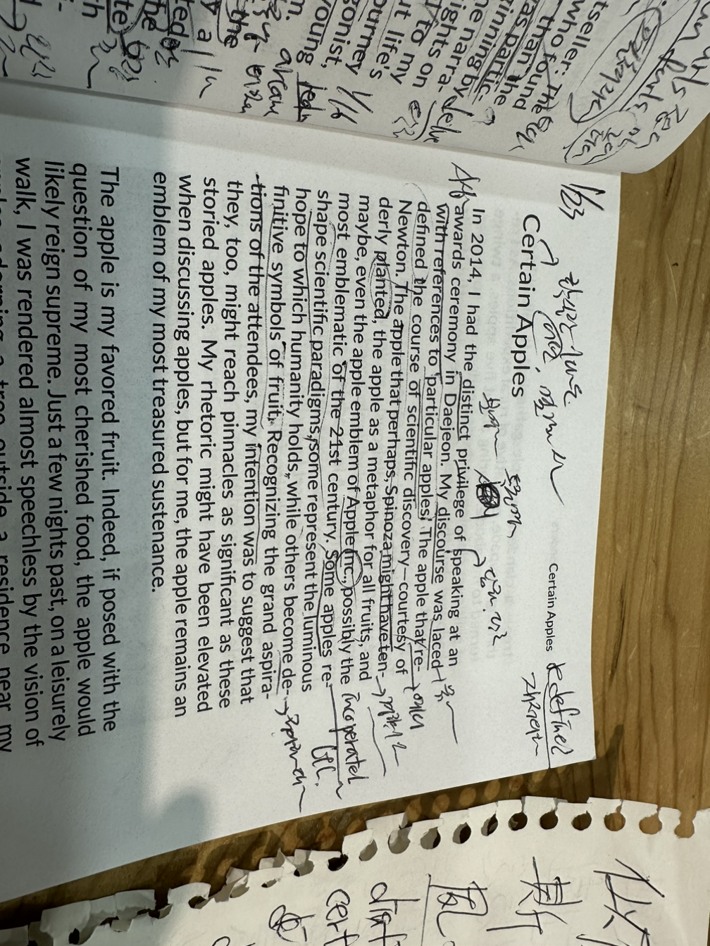그 사과란 어쩌면, 스피노자가 심고자한 사과였을수도 있고 과일을 대표하는 품목으로서의 사과일수도 있으며, 어쩌면 21세기 가장 상징적인 표식이기도 한 애플사의 애플 로고 일수도 있다. 사과란 과학적 틀에서 재형상화되기도 하고, 인간성을 담지하기 위한 어둠속의 불빛 같은 희망으로써 재현되는 사과일수도 있고, 모든 과일을 대표하는 기호로서 정의될수도 있다.