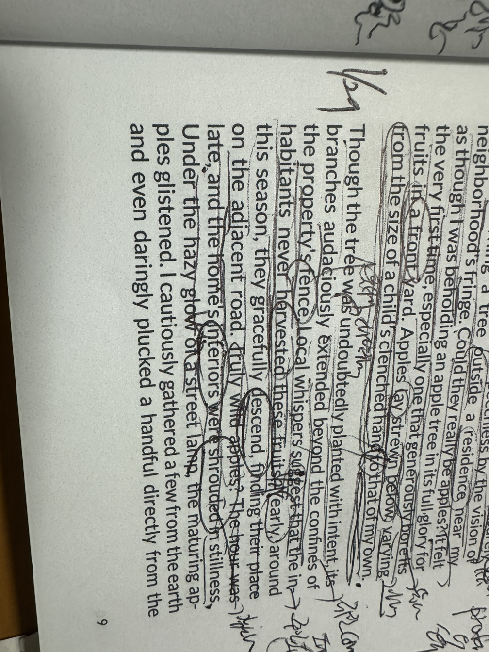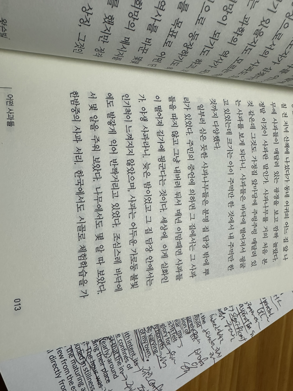 일부러 심은 듯한 사과나무들은 분명 집 담장 밖에 뿌리가 있었다. 주민의 증언에 의하면 그 집에서는 그 사과들을 따지 않고 그냥 내버려 둬서 매년 이맘때면 사과들이 떨어져 길가에 뒹군다는 것이다. 세상에. 이게 실화인가. 야생 사과라니. 늦은 밤이었고 그 집 담장 안에서는 인기척이 느껴지지 않았으며.