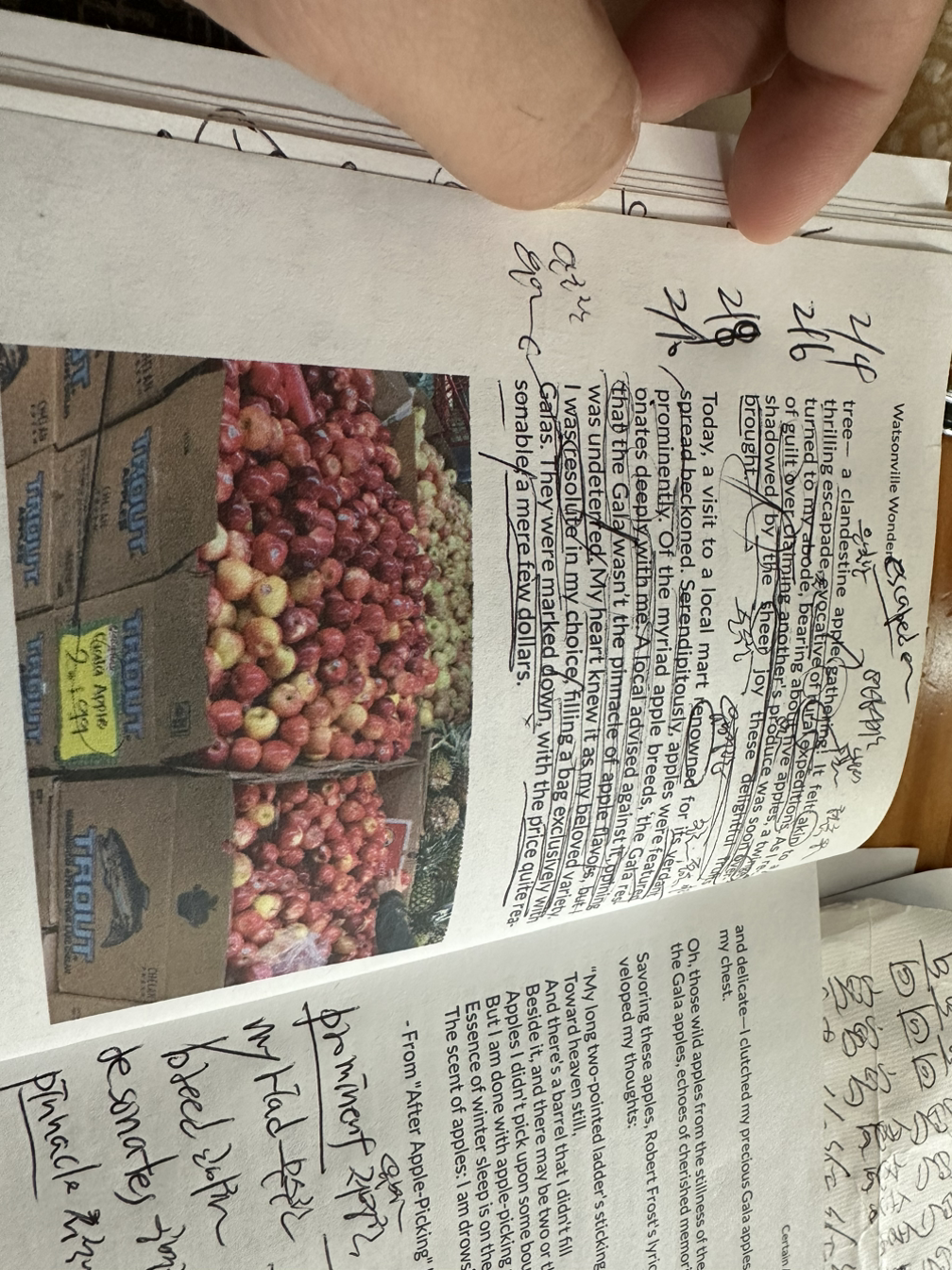 오늘, 젊은이들이 가도 좋은 마트로 유명한 지역마트에 가서, 필연적으로 사과를 자주 보게 되었다. 다양한 사과 종류 중 더 갈라가 내 맘 속 깊이 파고들었다. 더 갈라는 확산되는 초기에는 사과 맛의 최고는 아니라고 반대하는 지역 사람도 있지만, 나는 개의치 않는다. 나는 그 종류를 깊이 사랑한다. 나는 내 선택에 당당했고, 내 가방을 그 종류로 가득 채웠다.