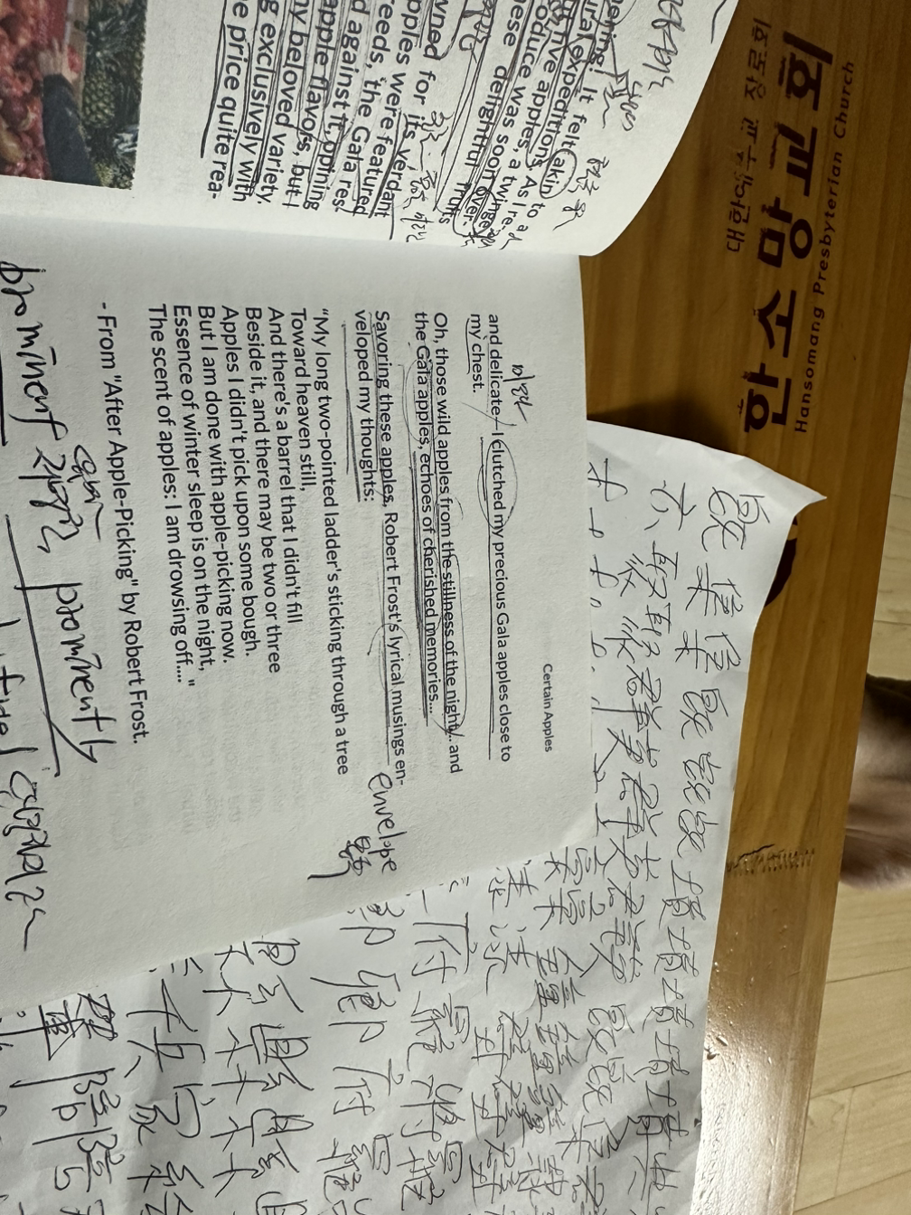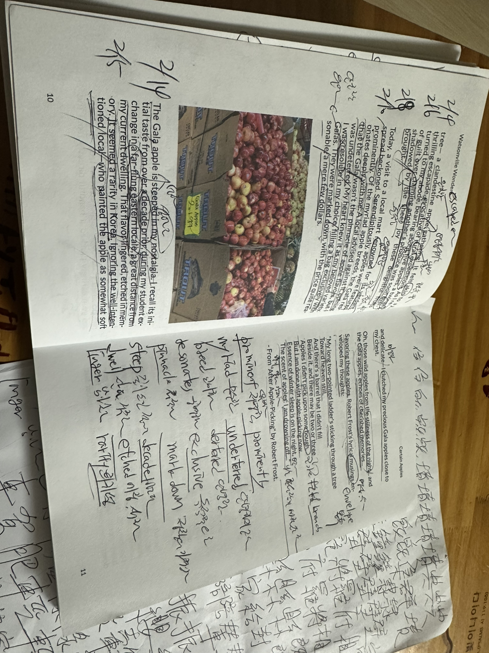누군가 좋은 의도로 사과를 무언가 부드럽고 연약한 무언가로 색칠한 것을 무시한 채 나는 귀한 갈라 사과를 내 가슴 가까이 꼭 끌어 안았다. 오, 밤에 고요함 속에 있었던 그 야생 사과들이란! 그 갈라 사과들은 나의 가장 소중한 기억의 메아리였다. 이 사과들을 맛보면서 로버트 프로스트의 서정시가 내.생각을 감쌌다. (혹은 그냥 떠올랐다 정도?)