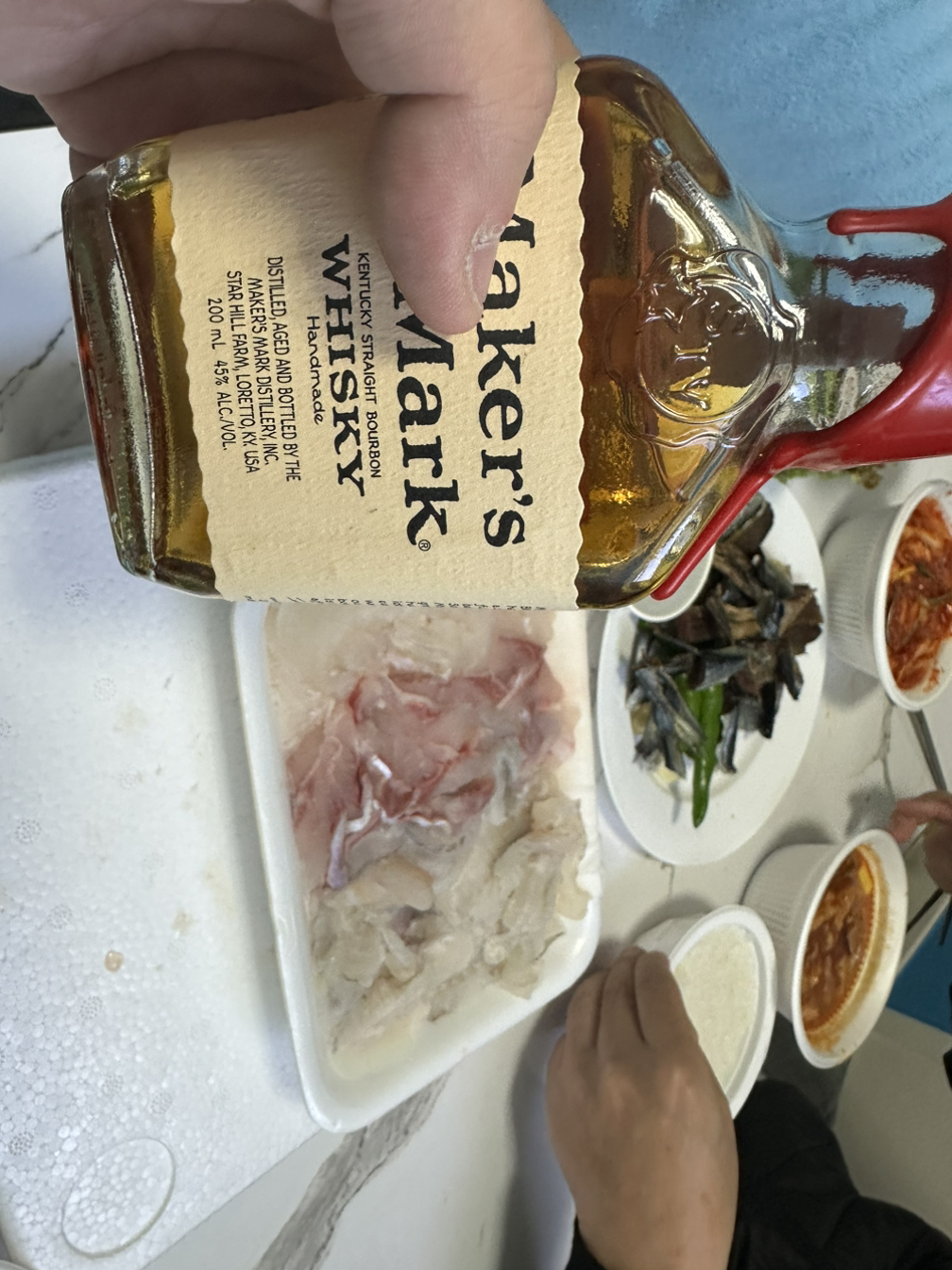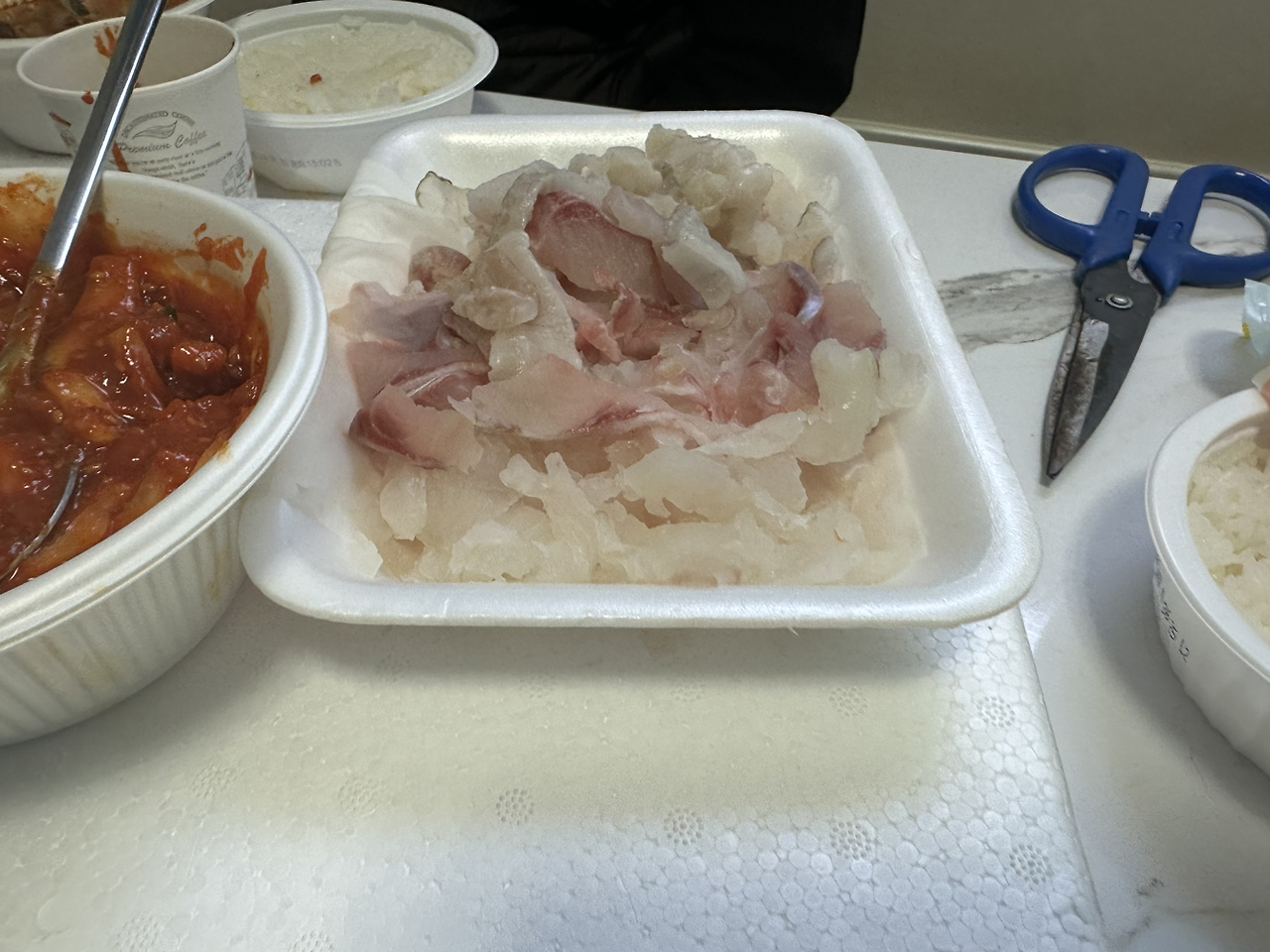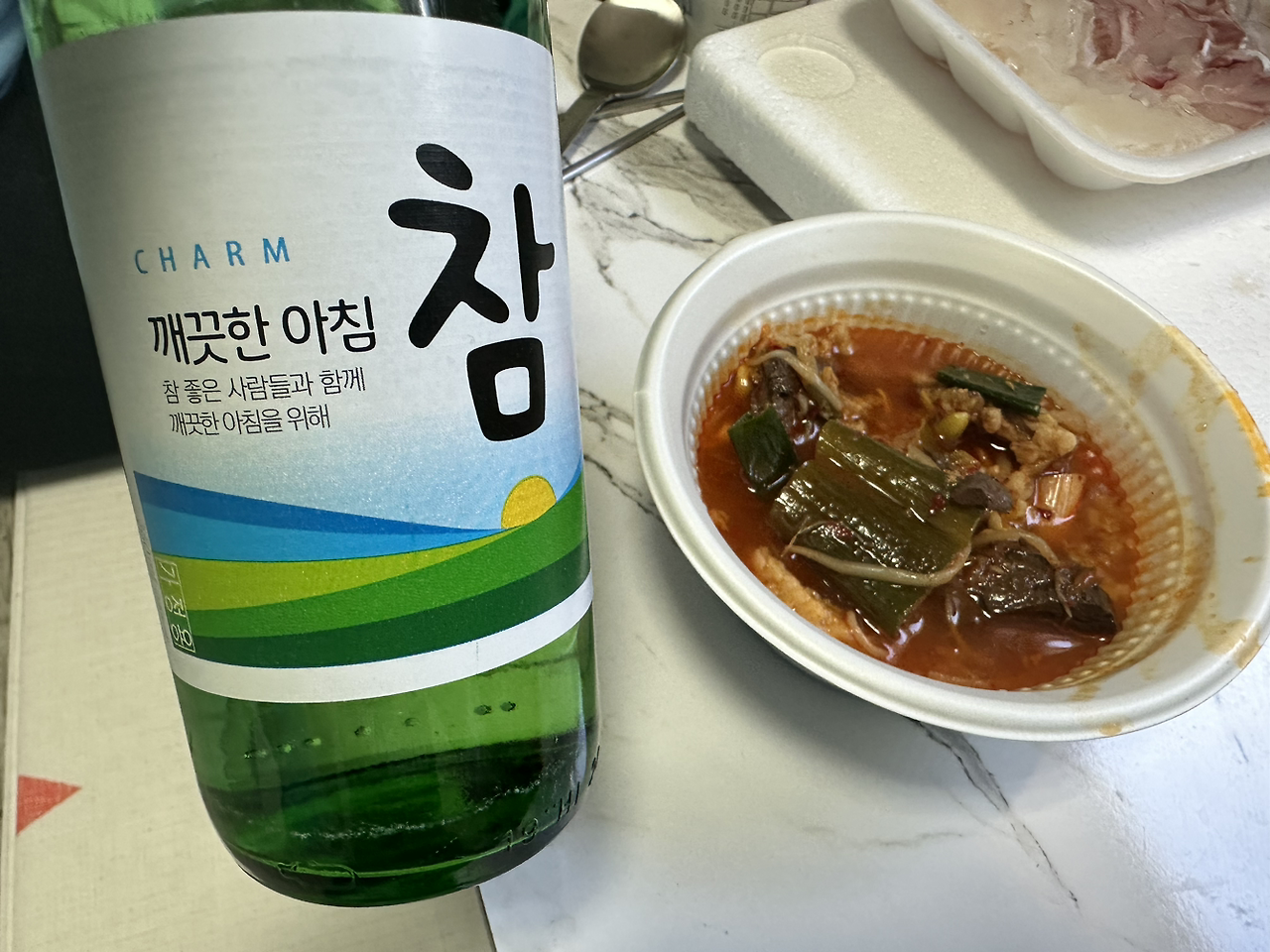 어머님 살아계실때부터 회, 회, 회 노래를 부르는 사위 두신 덕에 아버님은 이른 아침 부산 잘 아는 횟집에서 광어와 도다리, 흔히 밀치라고 불리는 가숭어를 잔뜩 떠오셨다. 이틀 간 내내 물리도록 먹었던 양이었다. 아직 소은이가 생기기 전, 비오는 부산에서 아버님은 그렇게 유명한 집이라며 신평국밥을 소개해주셧는데, 아침 아홉시부터 맑은 국물에 소주 한 병 하며 감탄을 금치 못하던 그 때가 눈에 선하다. 아버님은 그 떄를 기억하시고, 한번 먹어봤던 탕이라며 이번에는 수구레국밥을 포장해오신 것이었다. 빨간 국물은 겉보기와 달리 맵지 않았고, 소의 겉 피부와 그 아래의 살코기까지 얇게 발라낸 수구레도 쫄깃하고 맛있었지만, 무엇보다 정말 일품이었던 것은, 다름아닌 선지! 굳은 피 삶아 썰어낸 것 아닌가 싶었는데, 아무리 재료가 좋아도 그렇지 뭘 어떻게 삶아냈는지 혀에 닿는 순간부터 탱글탱글하고, 앞니로 자를때부터 어금니로 씹을때까지 짝짝 소리와 함께 약간 끈적하면서도 탄력있는 식감이 이루 말할 수 없이 좋았다. 그야말로 선지 회를 먹는 듯한 기분이었다. 사실 아버님이 회를 잔뜩 떠오신단 사실을 알고 있었기에, 나는 정 선생님의 위스키를 준비했는데, 도저히 이 절묘한 국물에는 오히려 소주가 더욱 어울릴 터였다. 그래서 나는 염치불구하고 위스키 두어 잔에 생선회를 잔뜩 먹었고, 이후 토렴하듯이, 식은 밤에 더운 탕을 말아서, 참소주 한 병에 모조리 후루룩 먹어버렸다. 아버님은 사오길 잘했다며 정말 좋아하셨다. 특히 못 먹는 것 없는 전소은, 과메기에 이어 선지까지 '우와, 젤리다!' 하면서 뚝뚝 잘라서 모두 냠냠꿀꺽. 너 진짜 선지가 무슨 맛인지 알고 먹냐?!!!!