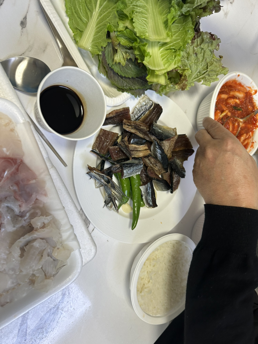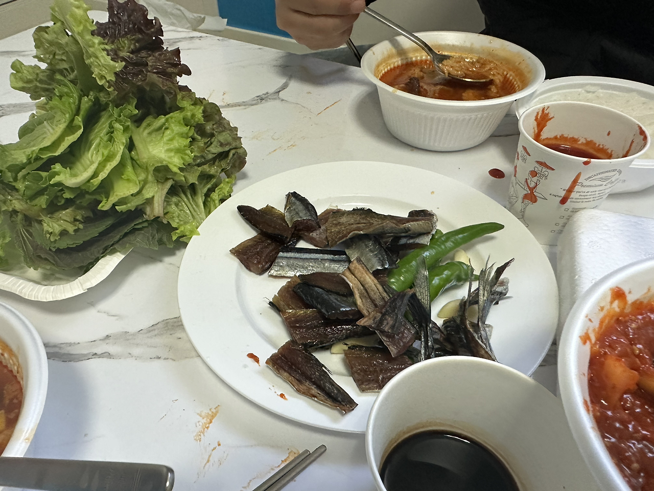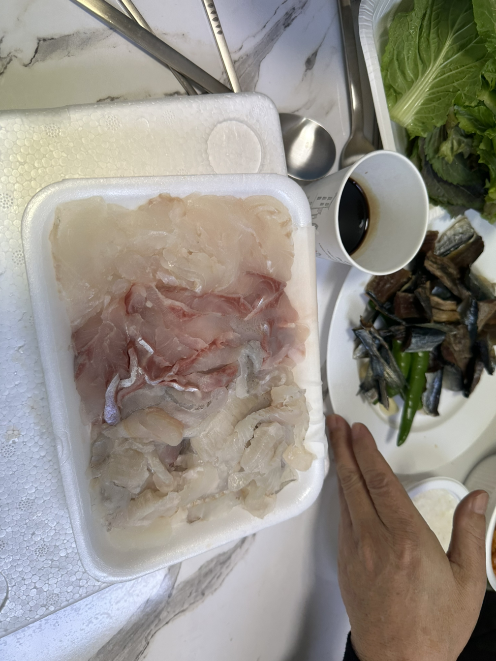 어머님 살아계실때부터 회, 회, 회 노래를 부르는 사위 두신 덕에 아버님은 이른 아침 부산 잘 아는 횟집에서 광어와 도다리, 흔히 밀치라고 불리는 가숭어를 잔뜩 떠오셨다. 이틀 간 내내 물리도록 먹었던 양이었다. 아직 소은이가 생기기 전, 비오는 부산에서 아버님은 그렇게 유명한 집이라며 신평국밥을 소개해주셧는데, 아침 아홉시부터 맑은 국물에 소주 한 병 하며 감탄을 금치 못하던 그 때가 눈에 선하다. 아버님은 그 떄를 기억하시고, 한번 먹어봤던 탕이라며 이번에는 수구레국밥을 포장해오신 것이었다. 빨간 국물은 겉보기와 달리 맵지 않았고, 소의 겉 피부와 그 아래의 살코기까지 얇게 발라낸 수구레도 쫄깃하고 맛있었지만, 무엇보다 정말 일품이었던 것은, 다름아닌 선지! 굳은 피 삶아 썰어낸 것 아닌가 싶었는데, 아무리 재료가 좋아도 그렇지 뭘 어떻게 삶아냈는지 혀에 닿는 순간부터 탱글탱글하고, 앞니로 자를때부터 어금니로 씹을때까지 짝짝 소리와 함께 약간 끈적하면서도 탄력있는 식감이 이루 말할 수 없이 좋았다. 그야말로 선지 회를 먹는 듯한 기분이었다. 사실 아버님이 회를 잔뜩 떠오신단 사실을 알고 있었기에, 나는 정 선생님의 위스키를 준비했는데, 도저히 이 절묘한 국물에는 오히려 소주가 더욱 어울릴 터였다. 그래서 나는 염치불구하고 위스키 두어 잔에 생선회를 잔뜩 먹었고, 이후 토렴하듯이, 식은 밤에 더운 탕을 말아서, 참소주 한 병에 모조리 후루룩 먹어버렸다. 아버님은 사오길 잘했다며 정말 좋아하셨다. 특히 못 먹는 것 없는 전소은, 과메기에 이어 선지까지 '우와, 젤리다!' 하면서 뚝뚝 잘라서 모두 냠냠꿀꺽. 너 진짜 선지가 무슨 맛인지 알고 먹냐?!!!!