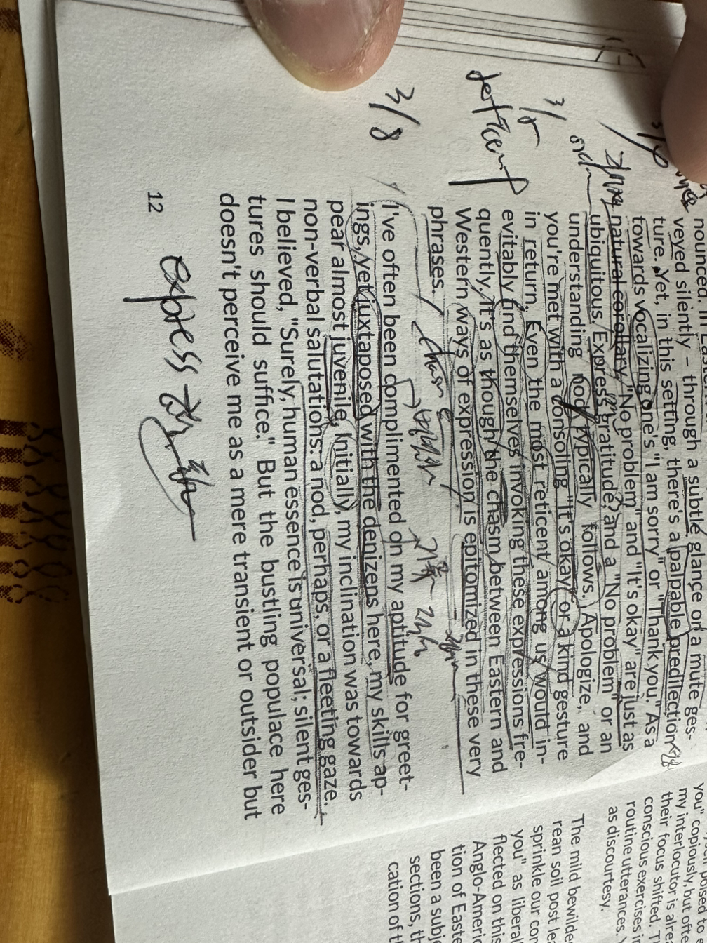 저는 종종 인사하는 것이 제 적성에 맞는다고 칭찬을 받아왔지만, 이곳의 주민들과 병치하면 제 실력은 거의 어린 것처럼 보입니다. 처음에, 제 성향은 비언어적인 경례, 예를 들어 고개를 끄덕이거나, 아니면 잠깐 동안의 시선이었습니다.