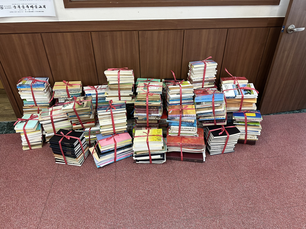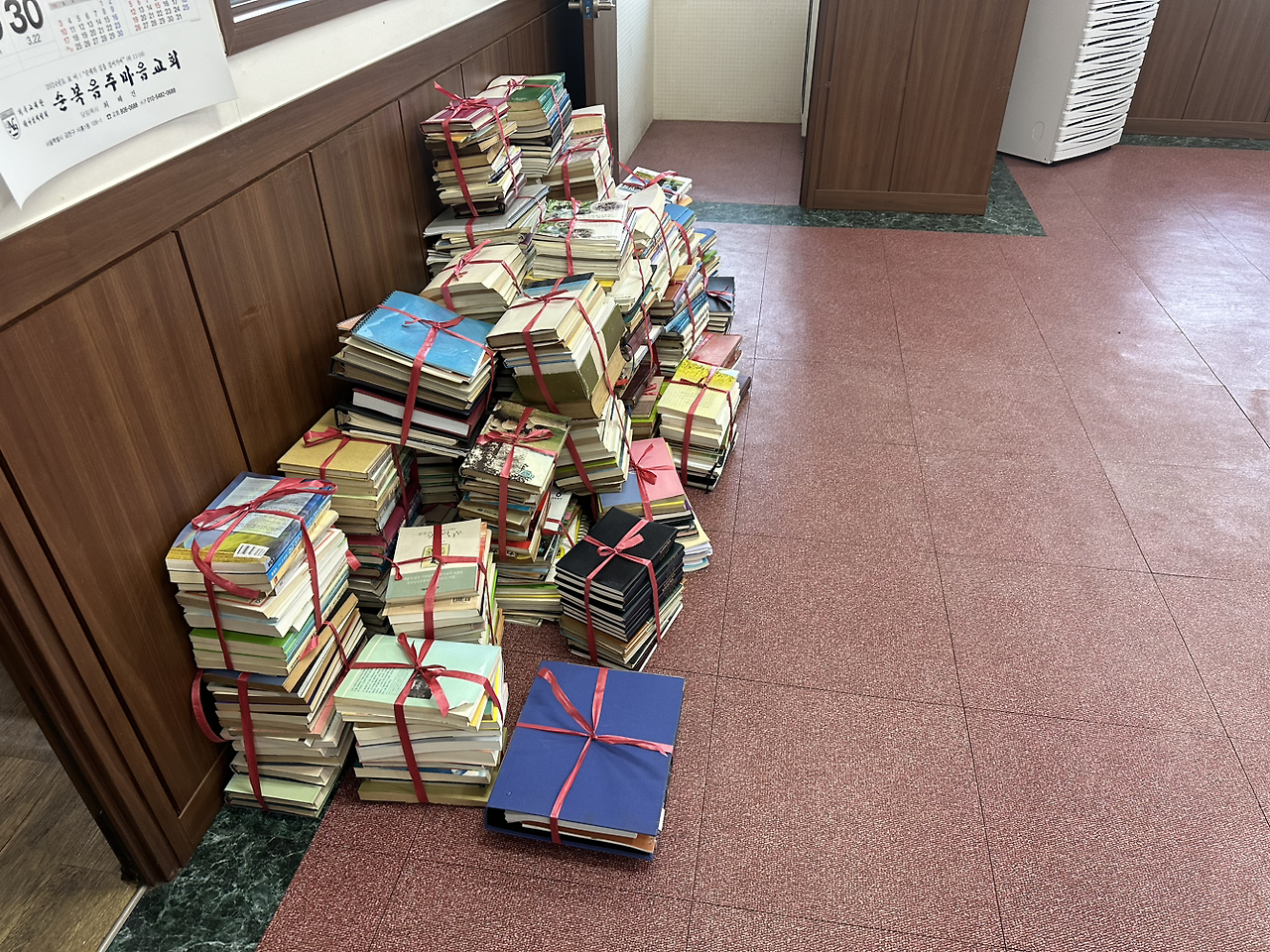 교회가 우리 집 기준으로 두어 정거장 더 가깝게 이사오면서, 여러 일을 도와야했다. 그래봐야 옛 성전에서 마지막 예배 보고 점심식사 후 두 시간 정도 이고 지고 나르고 한것밖에 없지만, 동료 결혼식 다녀온 아내가 죽치고 앉아서 저 많은 책을 다 손수 묶었다. 나는 그냥 시키는대로 이고 지고 져날랐을뿐. 다른 분들도 다 고생하셨지만 아내가 애썼다.