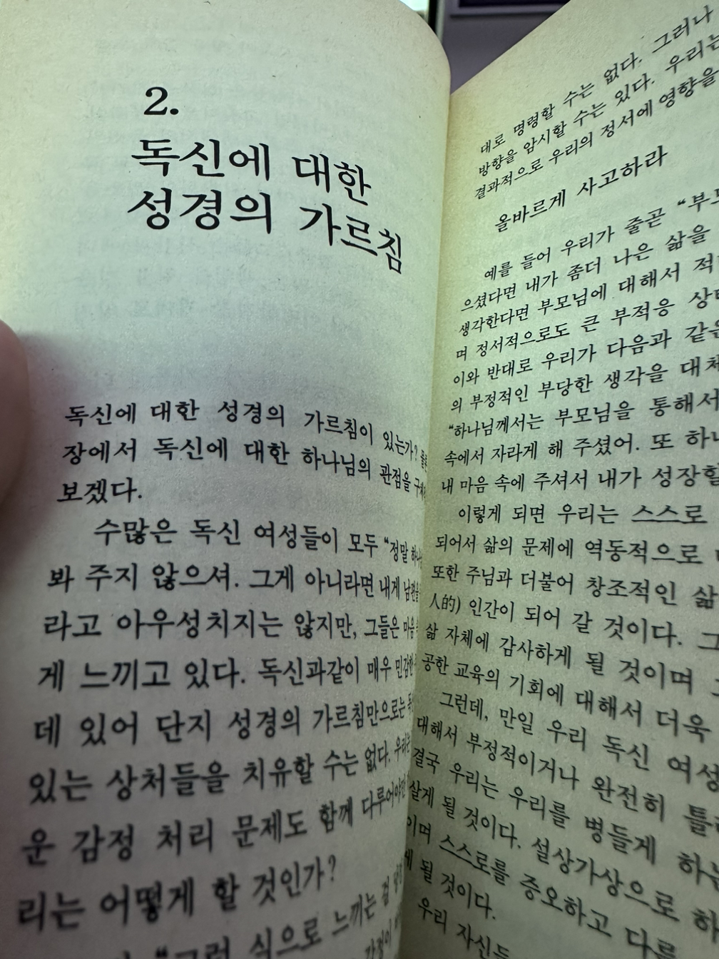 내 선입견과 달리, 미즈 에이다 럼은 단순하게 몇 개의 성경 구절을 들어 성욕이나 정욕이 부정적이다 하지 않고, 또한.무조건적으로 기도하여 배우자를 얻으라 하지 않는다. 그녀의 문장은 시종일관 차분하고, 지금보다 훨씬 경직된 시대에서 더군다나 의무적으로 교회 공동체에 속한 중년 미혼 여성이 어떻게 사소하지만 무례한 질문과 요구에 대해 품격있게 응수하는지, 육체적 정신적 외로움과 경제적 자립, 연애와 결혼에 대한 가능성의 여유를 어떻게 열어놓는지, 또한 미래를 손쉽게 그릴수없는 상황에서 어떻게 신앙을 유지해야할지 여러 성경 구절과 상황을 현실적으로 해석하여 대비해놓는다. 마치 옛 고전의 경구나 혹은 태권도교본의 기술을 실생활에 어떻게 적용해놓아야하는지 풀어놓은 맥락과도 비슷하다.