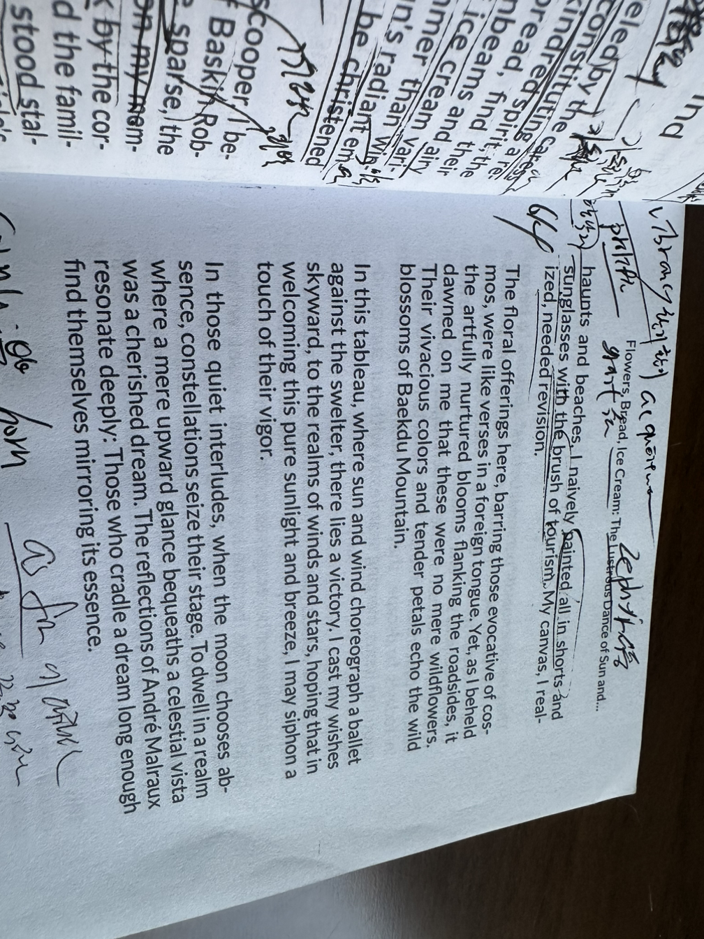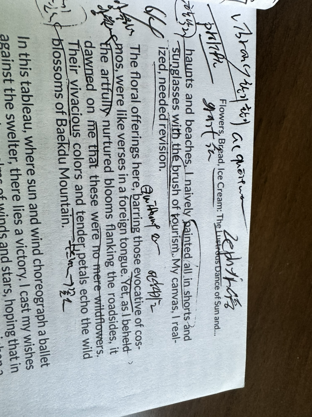 꽃들이 요청받듯 피어날때, 그처럼 코스모스의 향기가 날리지 않더라도, 꼭 외국 노래가사를 흥얼거리듯 보인다. 그럼에도 불구하고, 길가 가득히 예술적으로 피어 자라는 꽃들을 볼때마다, 그것은 단순히 내게 야생화로서만 다가오진 않는다. 그들의 발랄한 색깔과 부드러운 꽃잎들은 백두산의 야생화처럼 메아리친다.