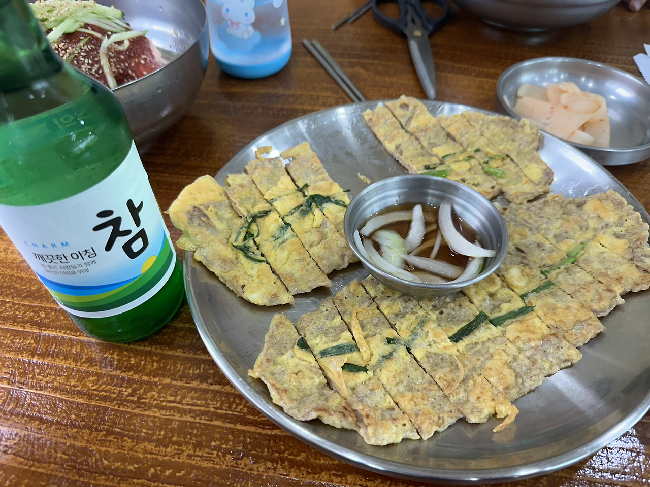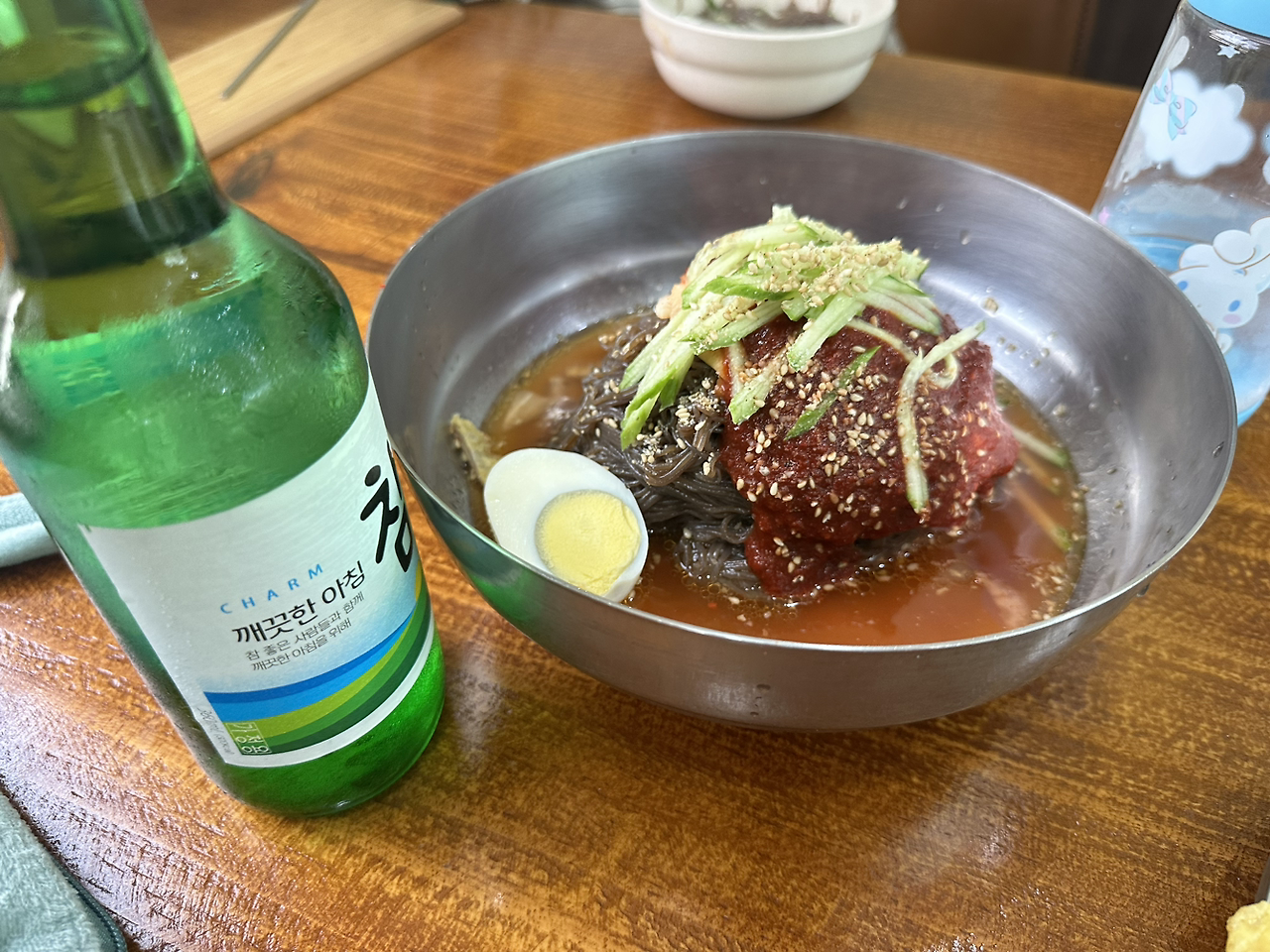 냉면 두 그릇, 육전 한 접시 앞에 놓고