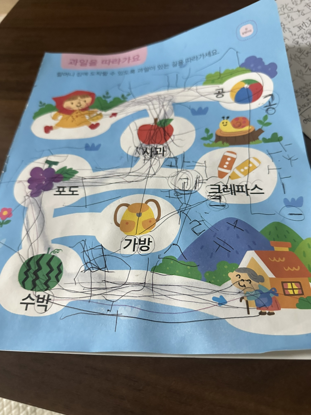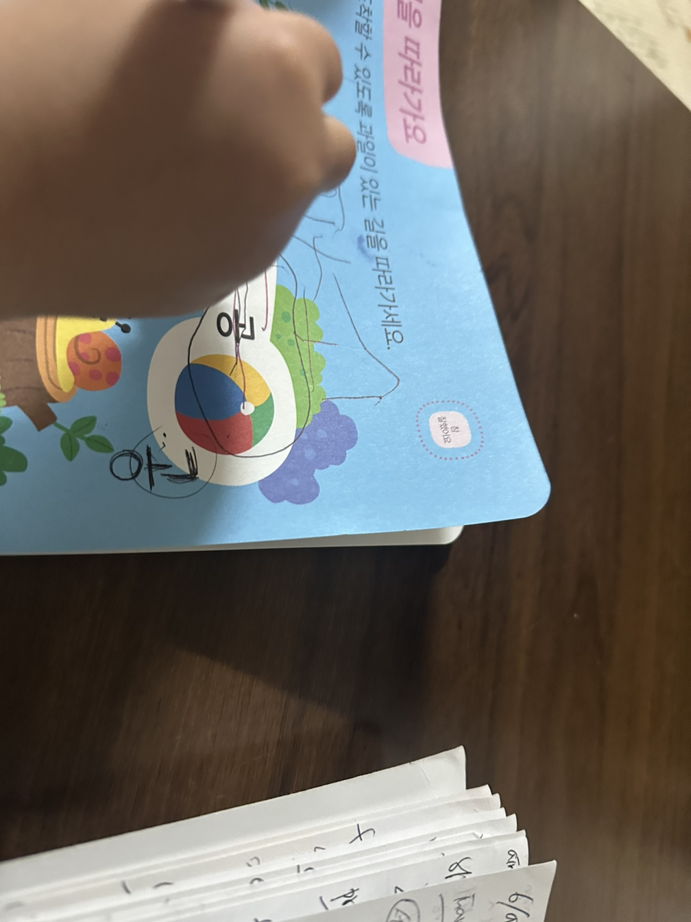 처음에는 내키지 않는듯, 장난치다 제 손으로 찢어먹은 한글 공부책 앞에 앉은 소은이는, 아빠, 사과부터 써볼까? 자, 봐아, 시이이이이이오오오오옷, 그리고 여기다 ㅏ 를 쓰면 아아아아아, 합쳐서 사과아아아, 볼펜 잡는 손은 아직 어설프고, 글씨도 익숙하진 않았지만 분명 조금씩 제대로 쓰고 있었다. 소은이가 오늘 쓴 한글공부 과정은 빨간모자가 엉뚱한 길로 들어서지 않고 과일만 만나며 할머니께 올바로 가는 내용이었는데, 사과, 포도, 수박을 자음 모음 구분하여 모두 썼을뿐 아니라 가방, 크레파스, 공 까지도 신이 나서 썼다. 나도 그동안 쭉 써온 한자가 오히려 너무 익숙한 나머지 날림으로 갈겨쓰는 버릇이 생겨 다잡느라 정자로 쓰는 연습중인데, 부녀가 제법 노심초사한 흔적이 보였다.