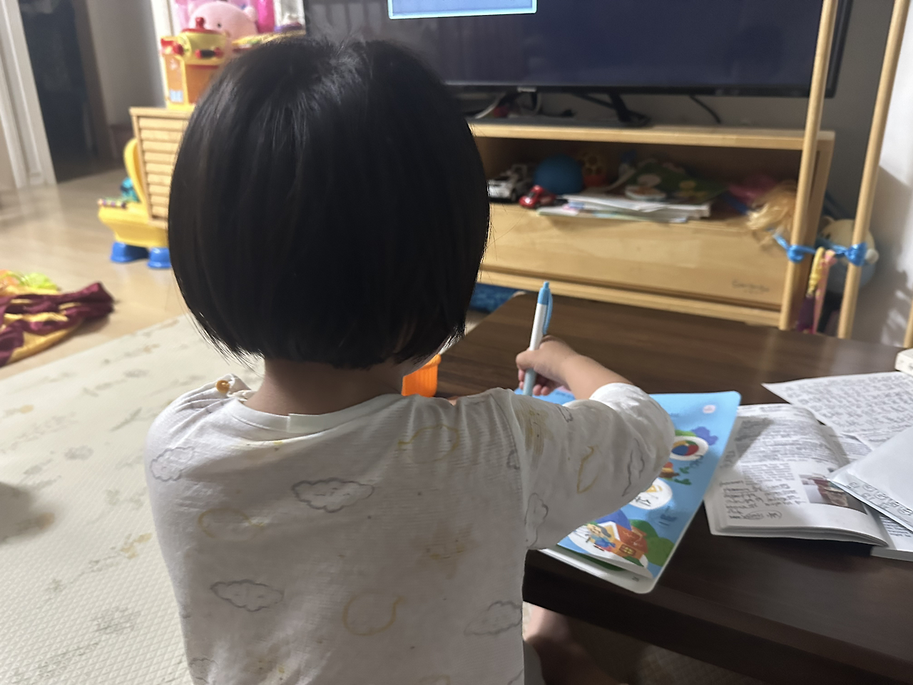 그렇다고 평일 저녁 공부가 결코 호락호락 쉽지만은 않다. 늘.뭐든 쓰고 읽는 애비 따라 아빠, 나도 공부할래요, 감동준 날은 물론 큰 기대는 아니 했지만, 기껏 하루이틀, 점점 할아버지 눈치봐가며 텔레비전만 보는가 했더니, 오늘은 티비 끄고 공부 좀 하자 하니, 오히려 제가 눈을 크게 뜨며, 아냐아, 소은이 오늘 공부 마아아니 해짜나! 응, 느가 누구랑 공부를 허냐? 오늘 어린이집에서 선생님하구 공부 해써어어, 그니까 아빠가 공부 많이 해! 하며 상에 펴둔 애비 영어 원서, 천자문을 툭툭 치기까지 하며 기세가 대단하다. 일찌기 손자 孫子 손무는 그래서 칼은 정면으로 날을 받지 말라 했던가. 속으로는 오냐, 지지배, 두고보자잉, 하는 마음으로 소은아, 그러면 지금.여덟시 반이니까 딱 밤 아홉시까지만 보고 공부하자, 약소옥, (애비의 진지한 서울말) 소은이는 찔끔 하는것 같더니, 아홉시가 되자 내키지 않는듯 책상에 앉긴 앉았다. 소은이가 티비보며 삼십분간 내게 장난감으로 커피도 만들어주고, 아이스크림도 만들어주는 동안, 나는 그 모든 이야기를 다 받아주며 내 영어와 한자를 조금이라도 썼다.